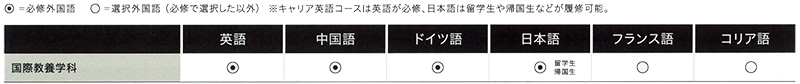 「国際教養学科」では、英語、中国語、ドイツ語、フランス語、コリア語、日本語(留学生向け)が学べます。複数言語の履修もできます。このうち、英語、中国語、ドイツ語から必修外国語を選択します(ただし、キャリア英語コースは英語が必修外国語)。