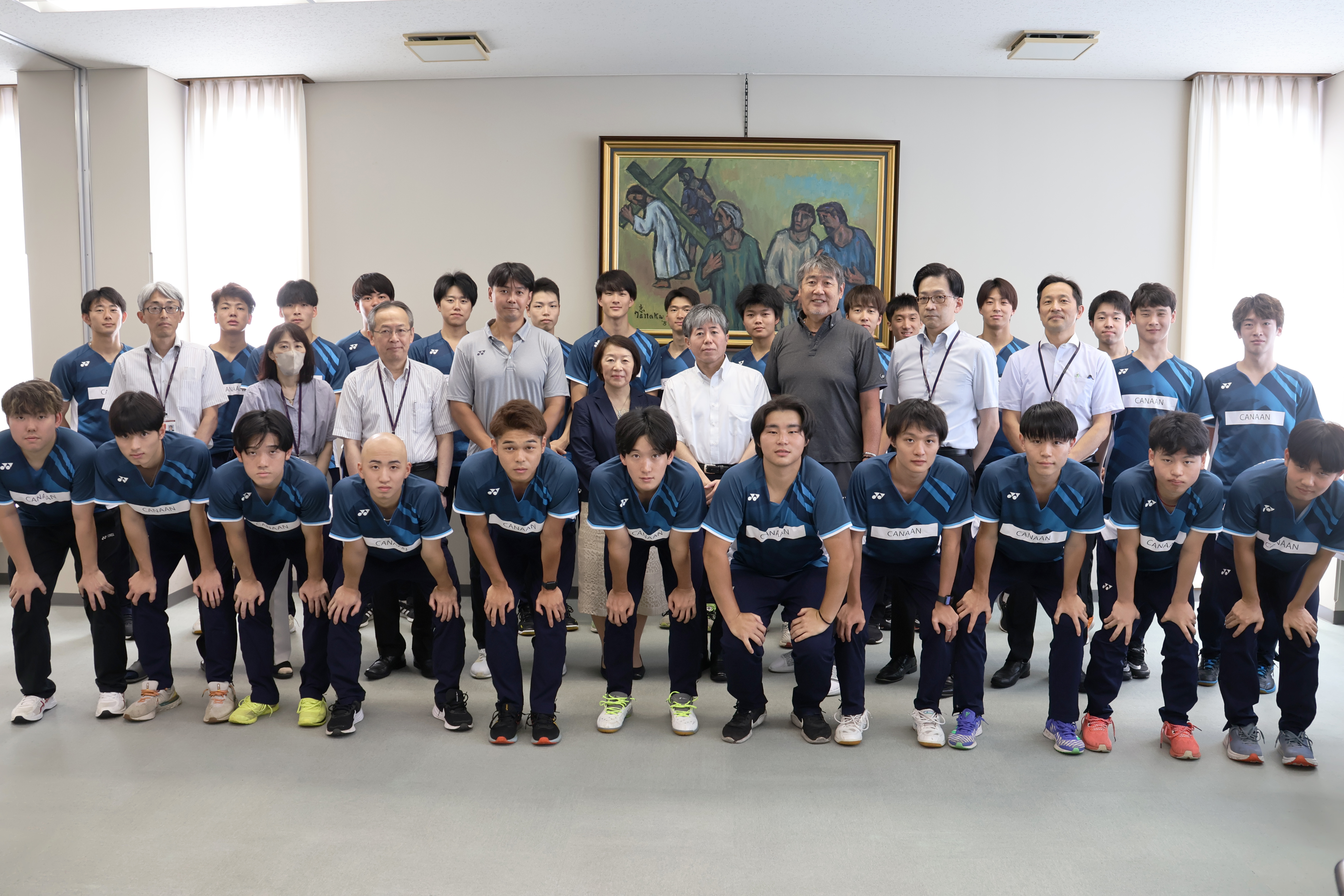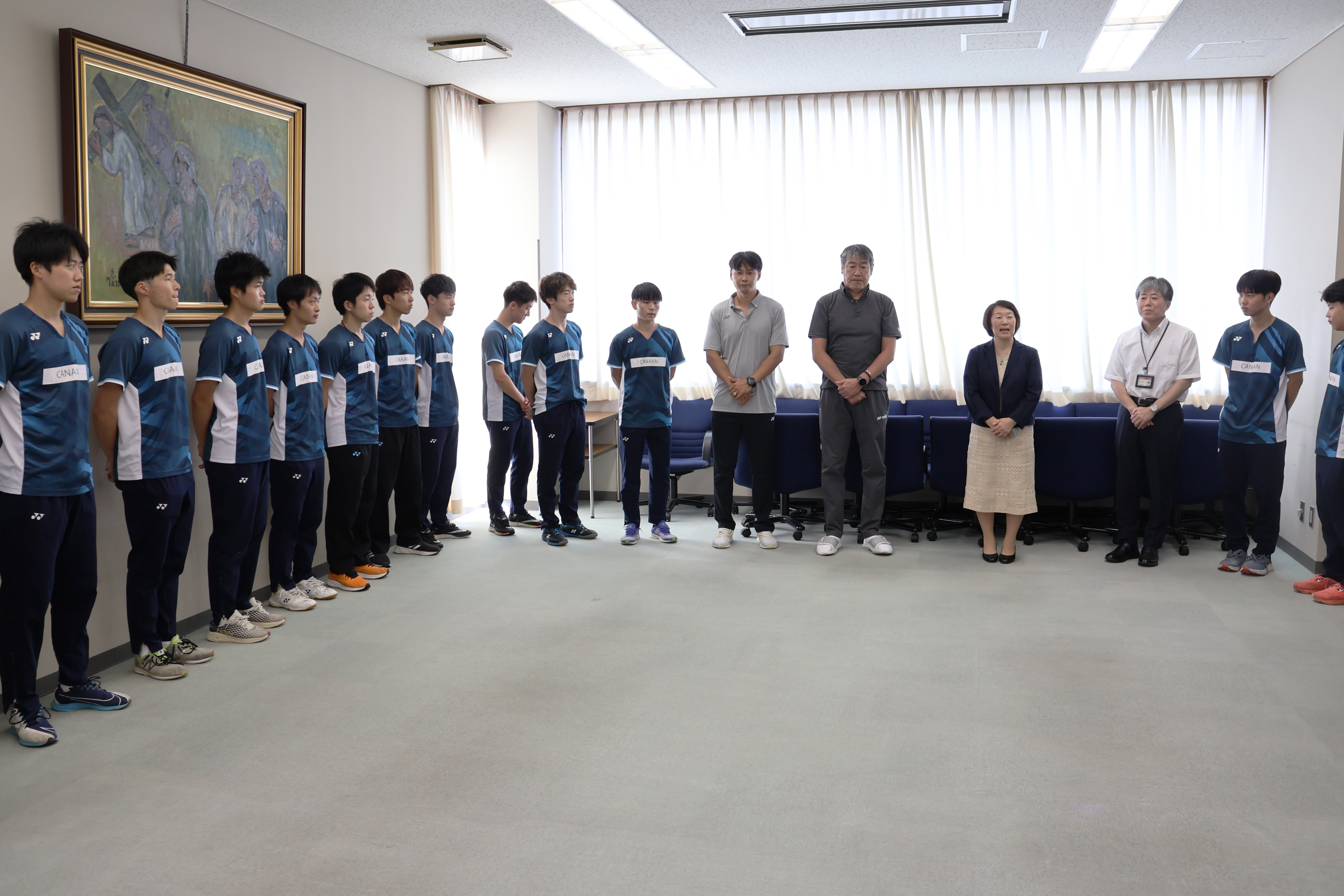 出発を控え、参加選手、監督、コーチが集まり、学長および事務局長、職員からの激励を受けました。