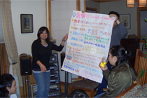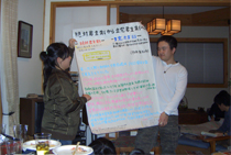 出発を前にメンバーたちは、一緒に活動を行う教員の自宅に集まって現地の方たちとの交流や住居建築活動に役立てるため、事前学習をしました。2名ずつ5組に分かれてタイの地理や宗教、歴史やことば、生活習慣などについて調べた結果を発表し、その後はみんなで持ち寄ったお料理でパーティーを楽しみました。