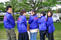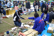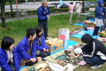 新入部員の活動は、海外ボランティアのための資金集めからはじまりました。新発田市カルチャーセンターで行われたフリーマーケットでは、小雨が降る中、陶芸部に協力していただいた陶器などを販売しました。小さな大学ですから、サークル同士のつながりも親密です。