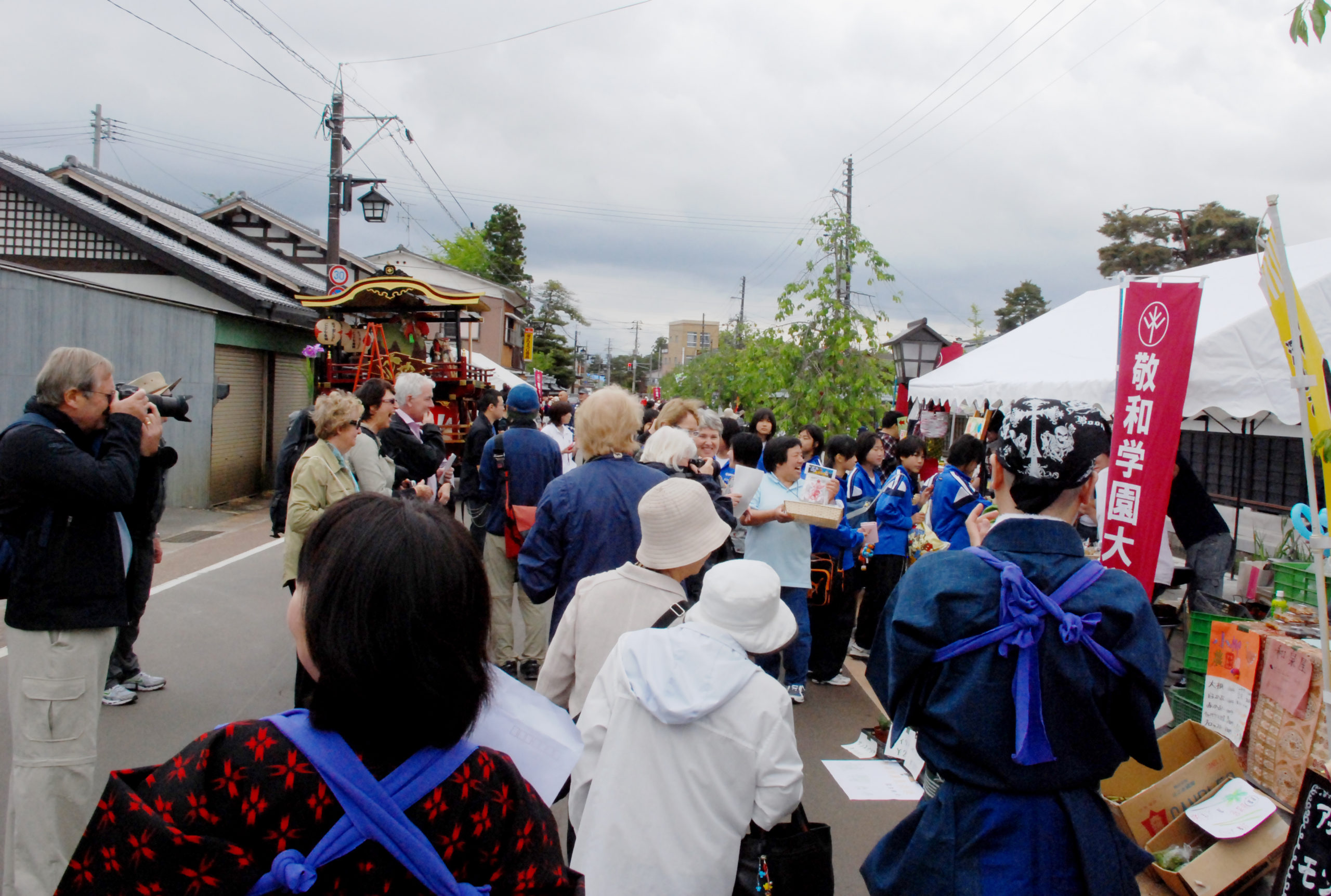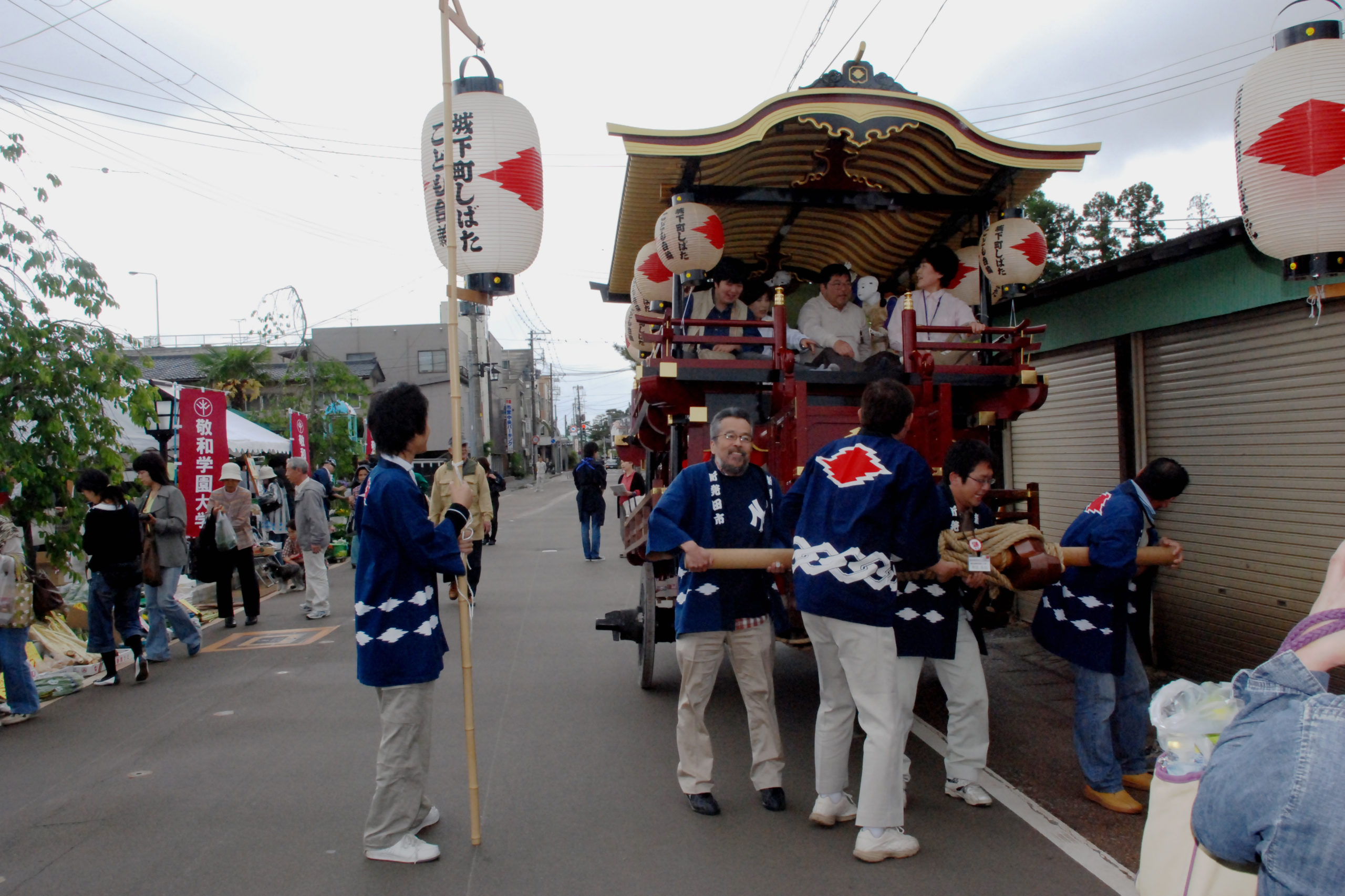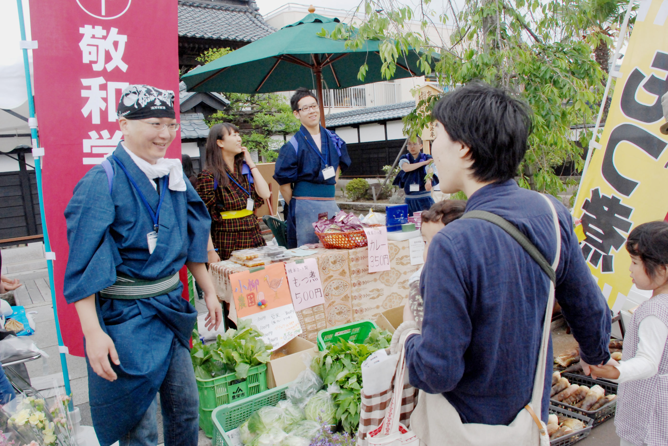 地元農産物、地魚など新鮮な産直産物以外に、自然食品、アロマ、地場産品などを提供できました。また新発田商業高校の皆さんの出店や子ども台輪の曳き出し、市内のフラダンスサークルや本学チアリーダーの演技も披露され、さまざまな交流の場としての十二斎市の雰囲気を出すことができました。