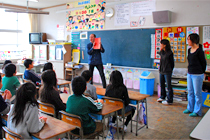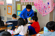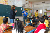 敬和学園大学のジョイ・ウイリアムズ先生と、シンディ・ザンボースキー先生のご主人フィリップ・ラスト先生が聖籠町立亀代小学校で学級活動などの時間を利用した英語の授業を行っています。「楽しく英語を使おう!」をテーマにコミュニケーションをとりながら進めるこの授業は今回で3回目になります。