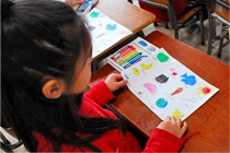 授業は日本語を極力使わず、英語のみで進められます。英語であいさつをしたり、ぬりえをしたり、カードを見ながら、色や物の名前の英語を覚ていきました。元気いっぱい楽しんでいる子どもたちの様子に学生たちの緊張もとけ、一緒に学ぶよろこびを実感することができました。