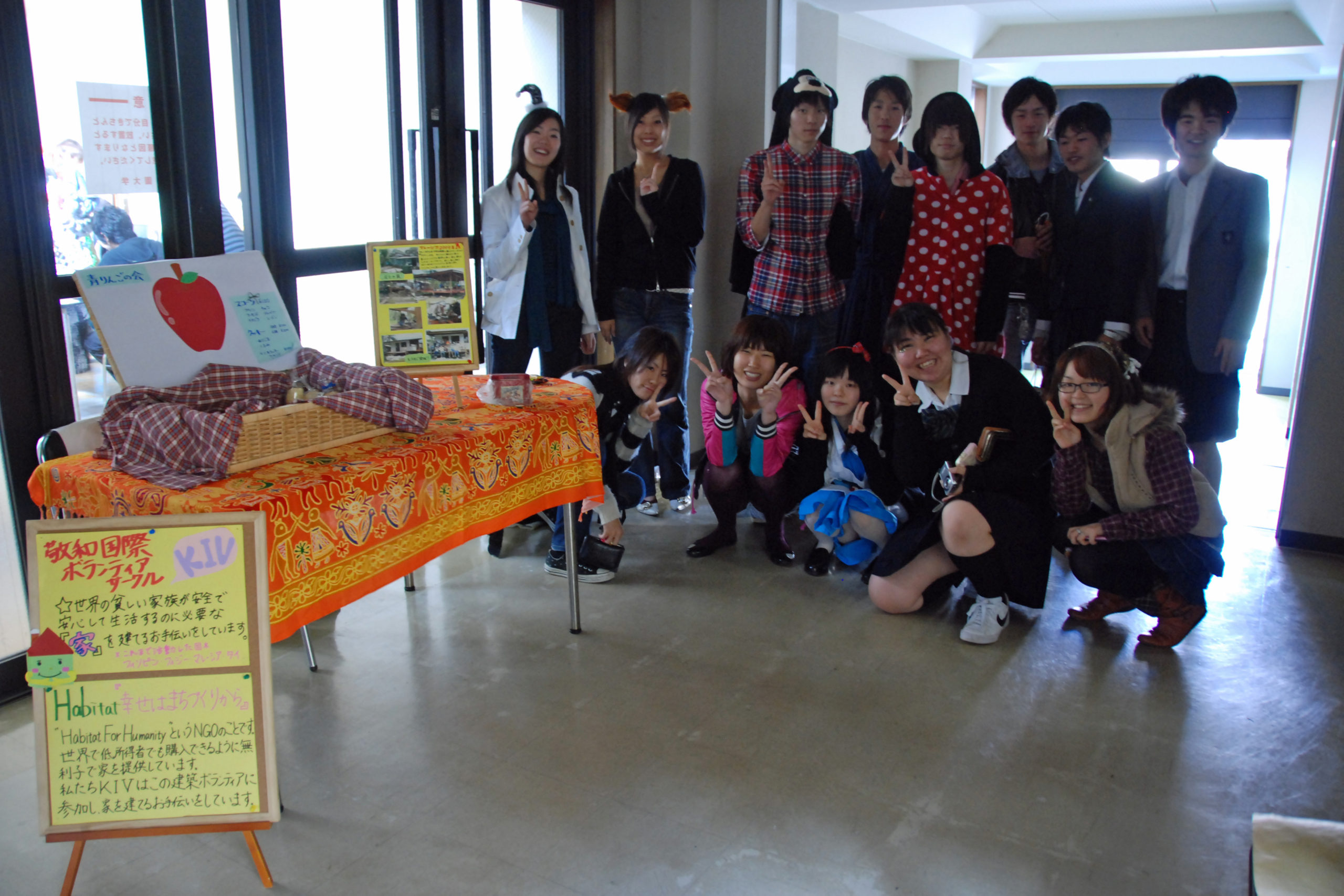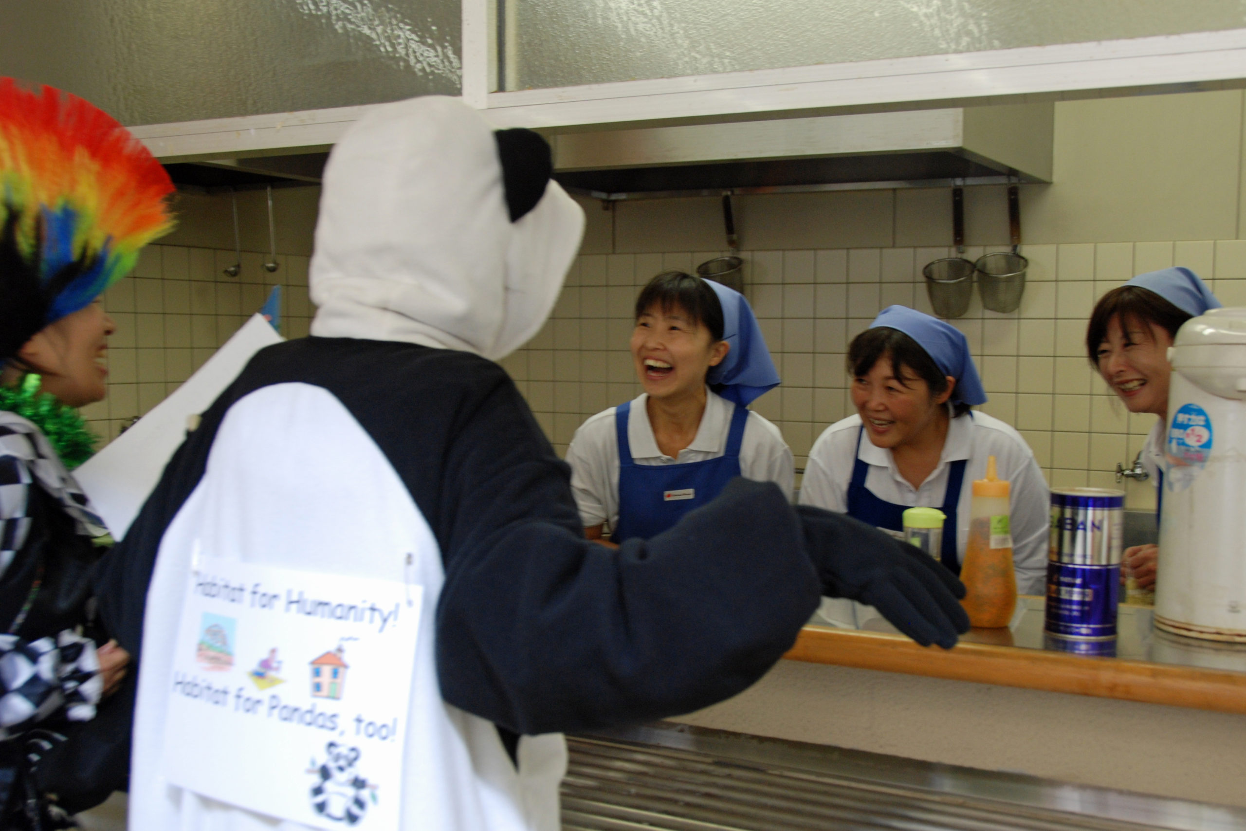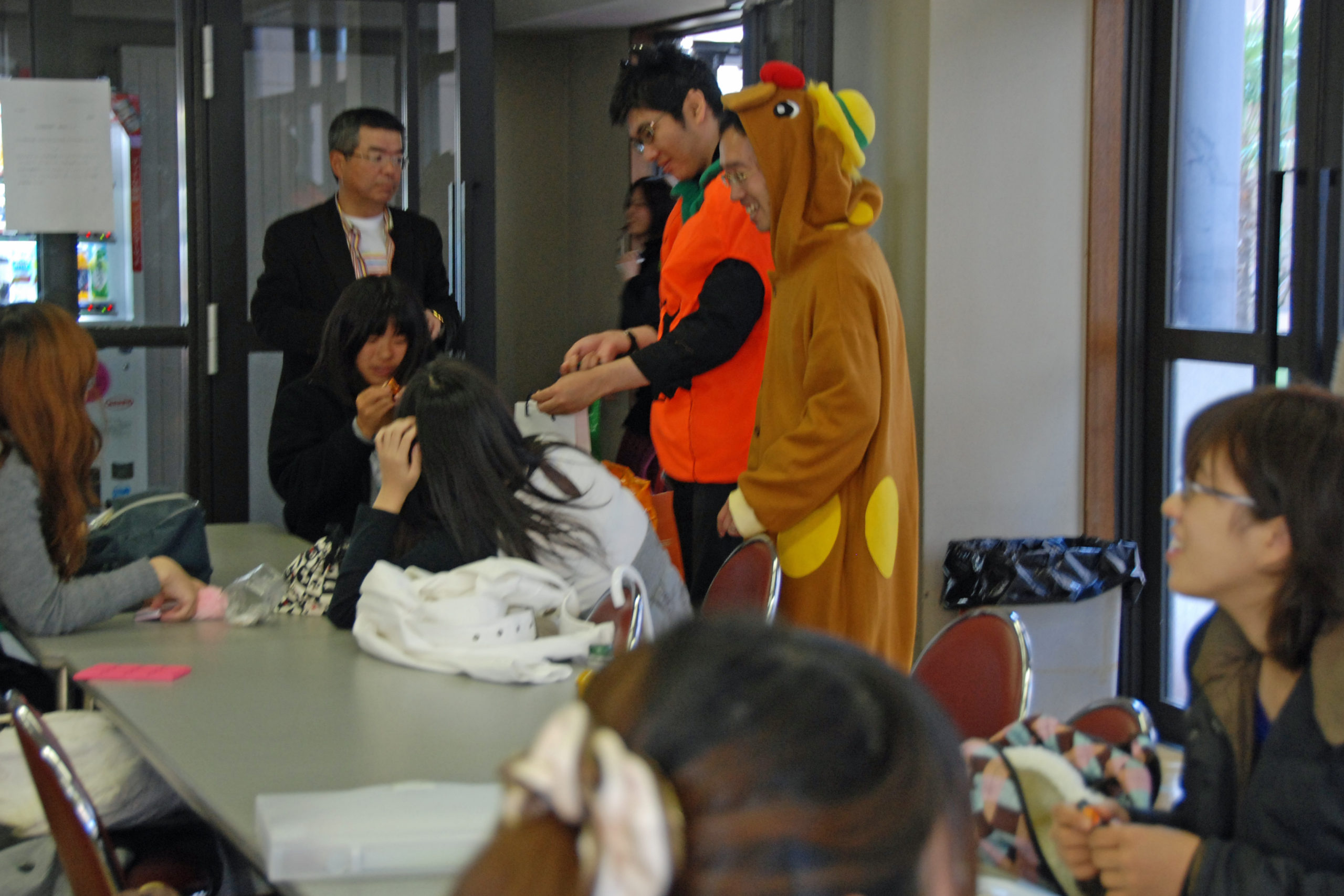 ハロウィンは魔女やお化けに仮装した子供達が「トリック・オア・トリート」と唱えてお菓子をもらいに近くの家を1軒ずつ訪ねるものですが、このパレードは少し違います。2月に行う海外での住居建設ボランティアのための募金をお願いし、協力してくれた皆さんにお菓子を配って歩くのです。学食で食事をしている学生たちは、普段の仲間や先生からは想像もつかない仮装に驚きつつも写真撮影や会話に楽しんでいました。