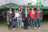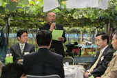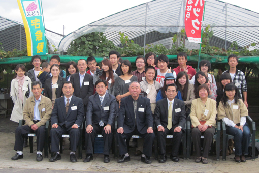 聖籠町は果樹の里、10月末までぶどう狩りのシーズンです。当日は聖籠町長、中国駐新潟総領事館総領事の方々と、もぎたてのぶどうを味わいながら楽しい歓談の時を持ちました。鈴木学長からのあいさつの中で、さきの東日本大震災の発生直後、本学留学生たちが、中国新潟総領事館で中国に帰国する皆さまの援助を献身的にこなしたこと、その行動に対して中国領事館から感謝状をいただいたことが紹介され、あらためて日本と中国の架け橋となる留学生たちの想いを共有しました。最後は、聖籠町長から参加者一人ひとりにぶどうのお土産をいただき、聖籠町の秋の味を満喫した一日となりました。