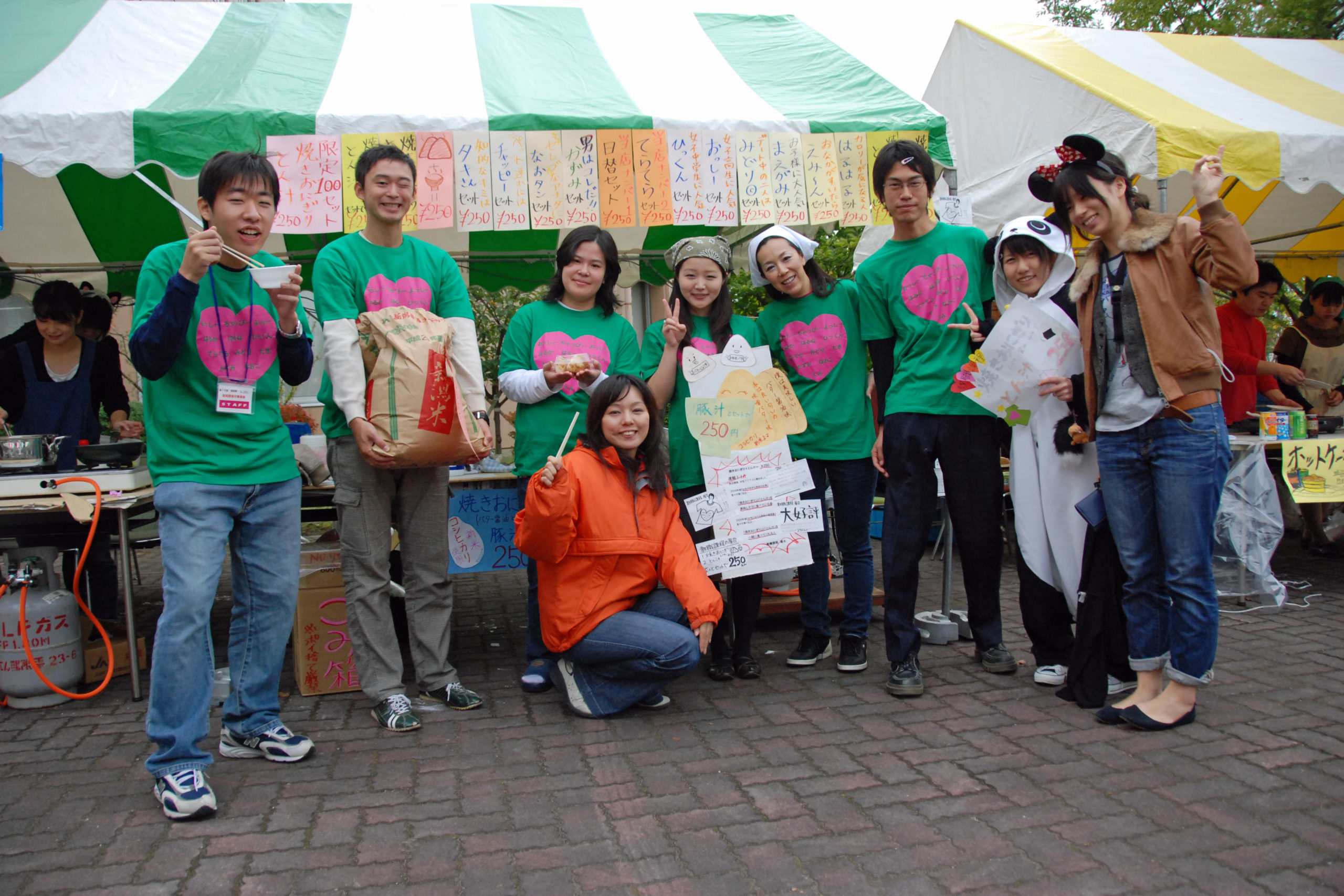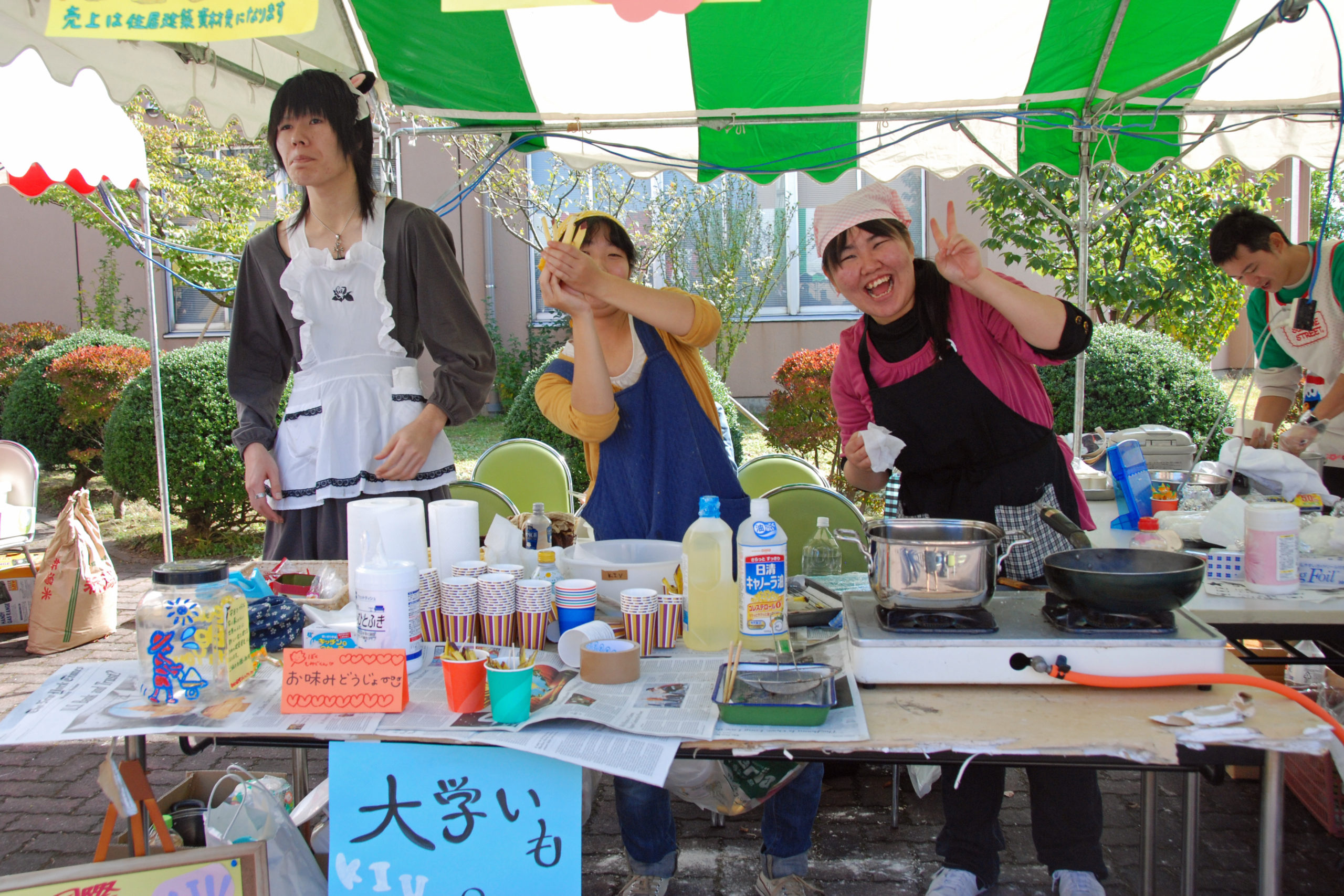 そんな学生たちの思いが通じてか、当日はすばらしい秋晴れとなりました。ゼミや部活の仲間と協力して出している屋台は、そばめしやスープ、大学いも、茶道部による抹茶など工夫をこらしたメニューが盛りだくさんでした。