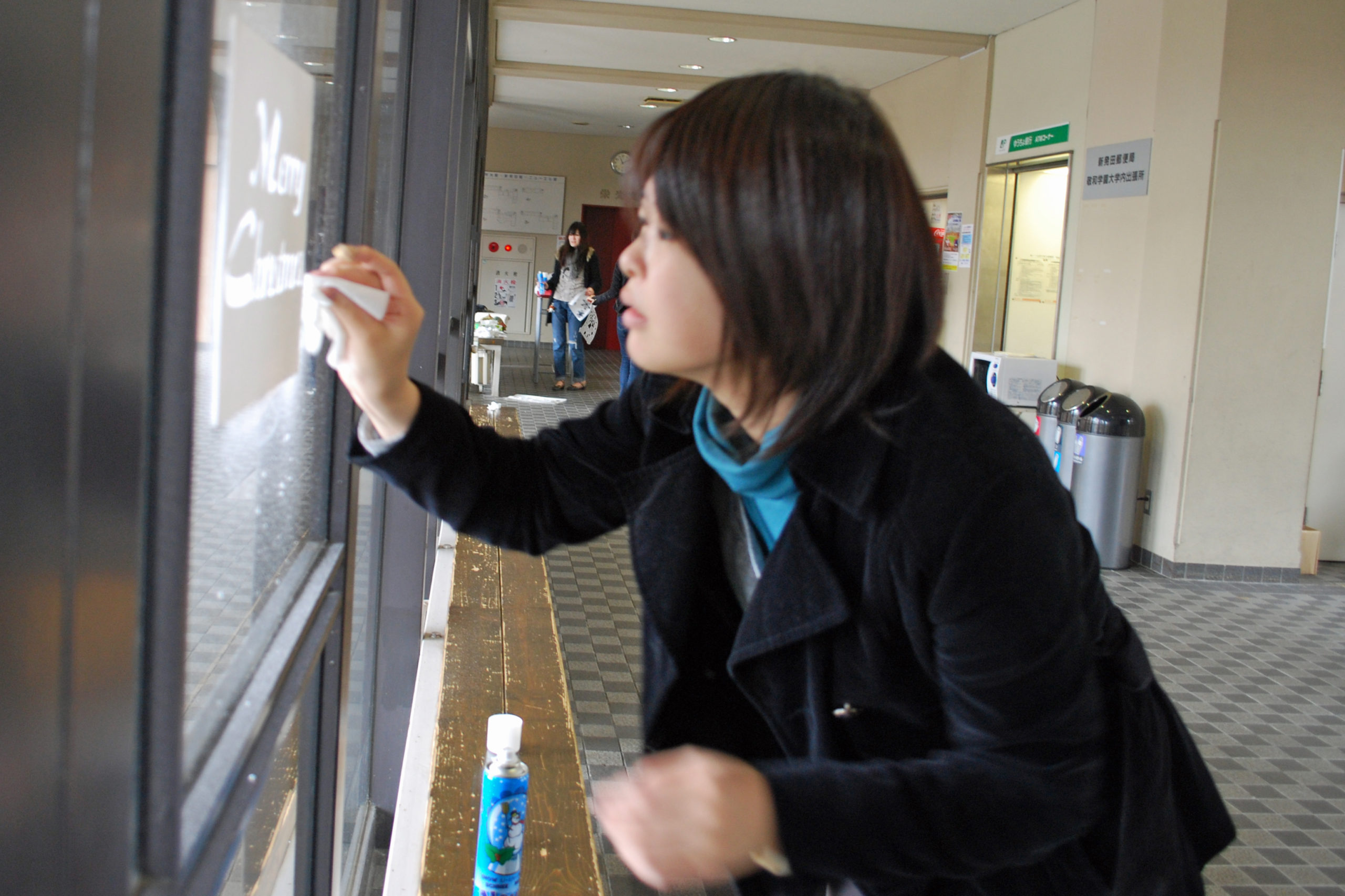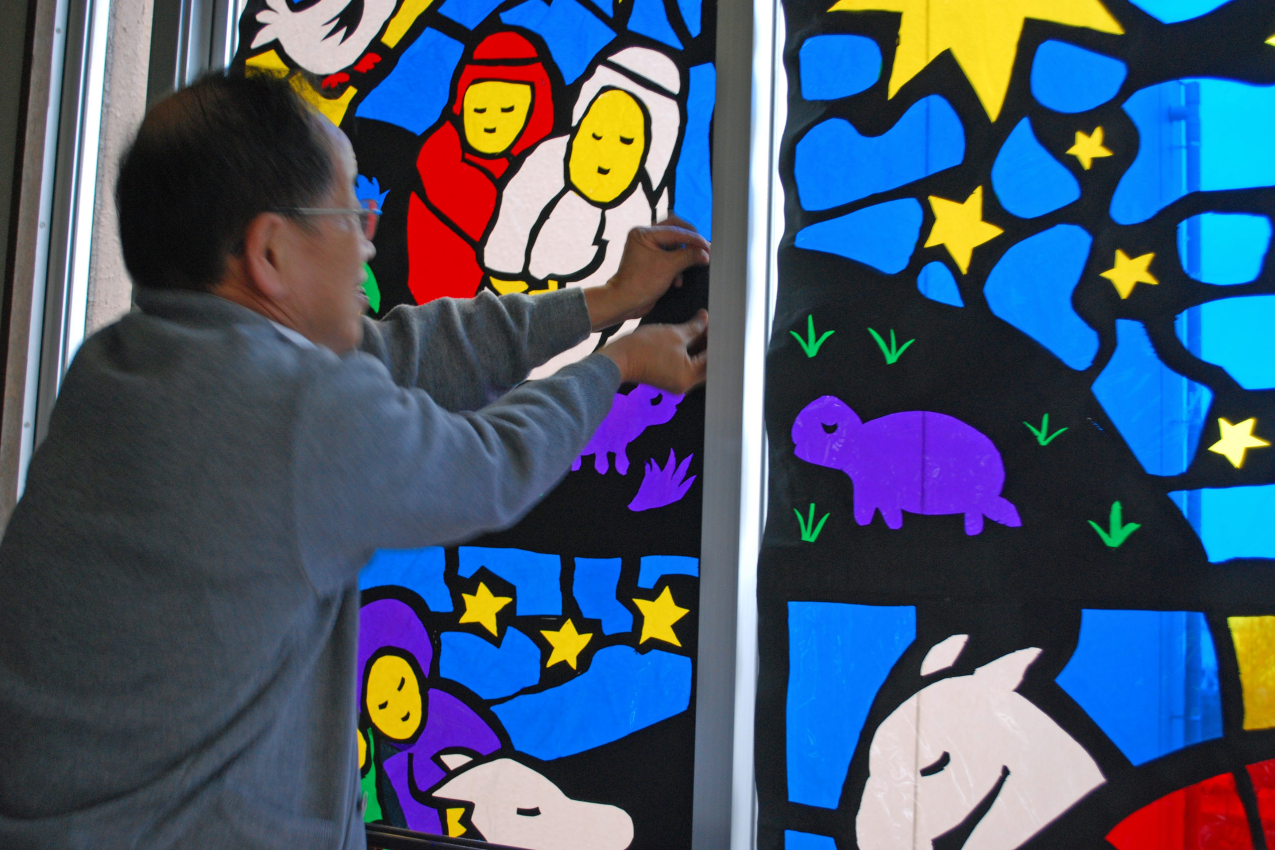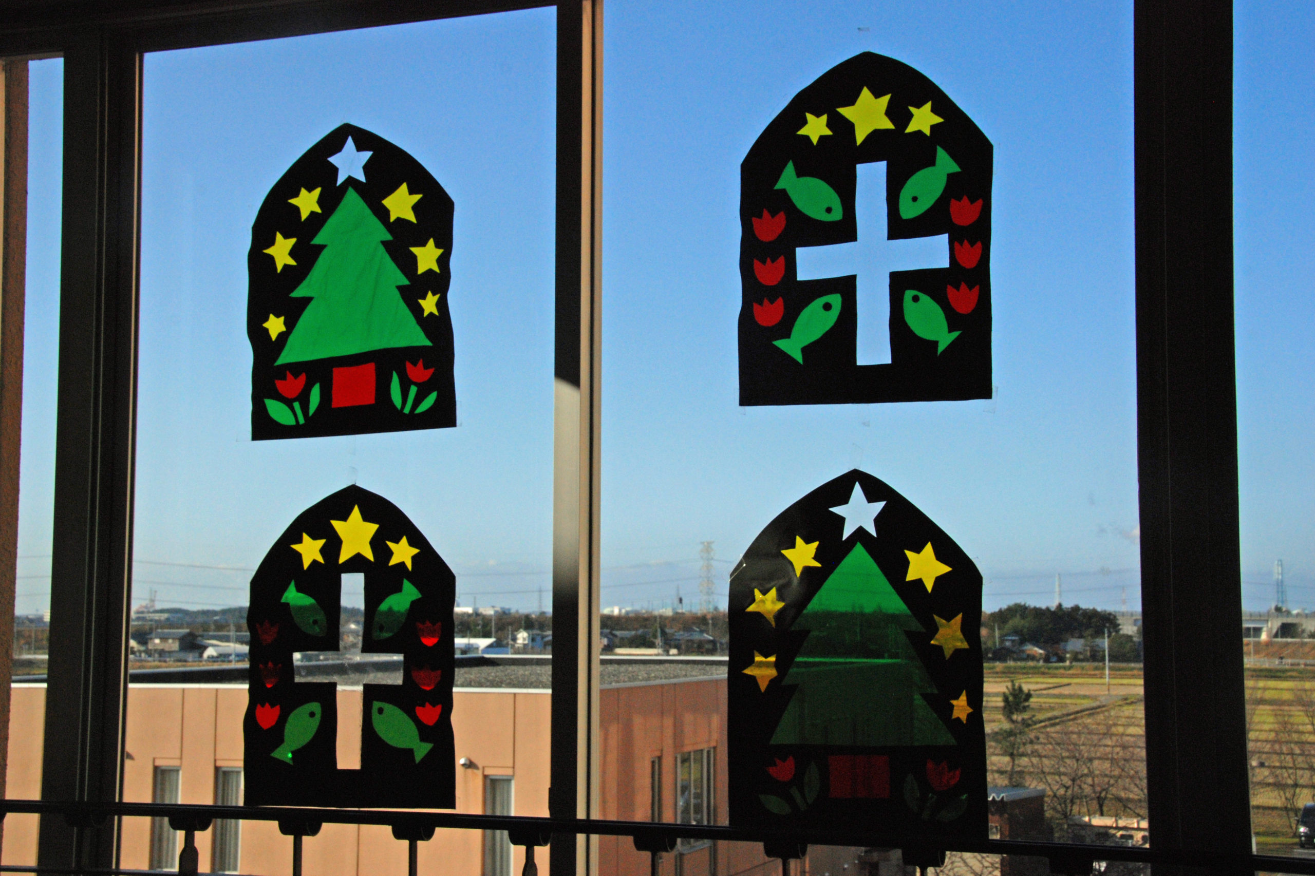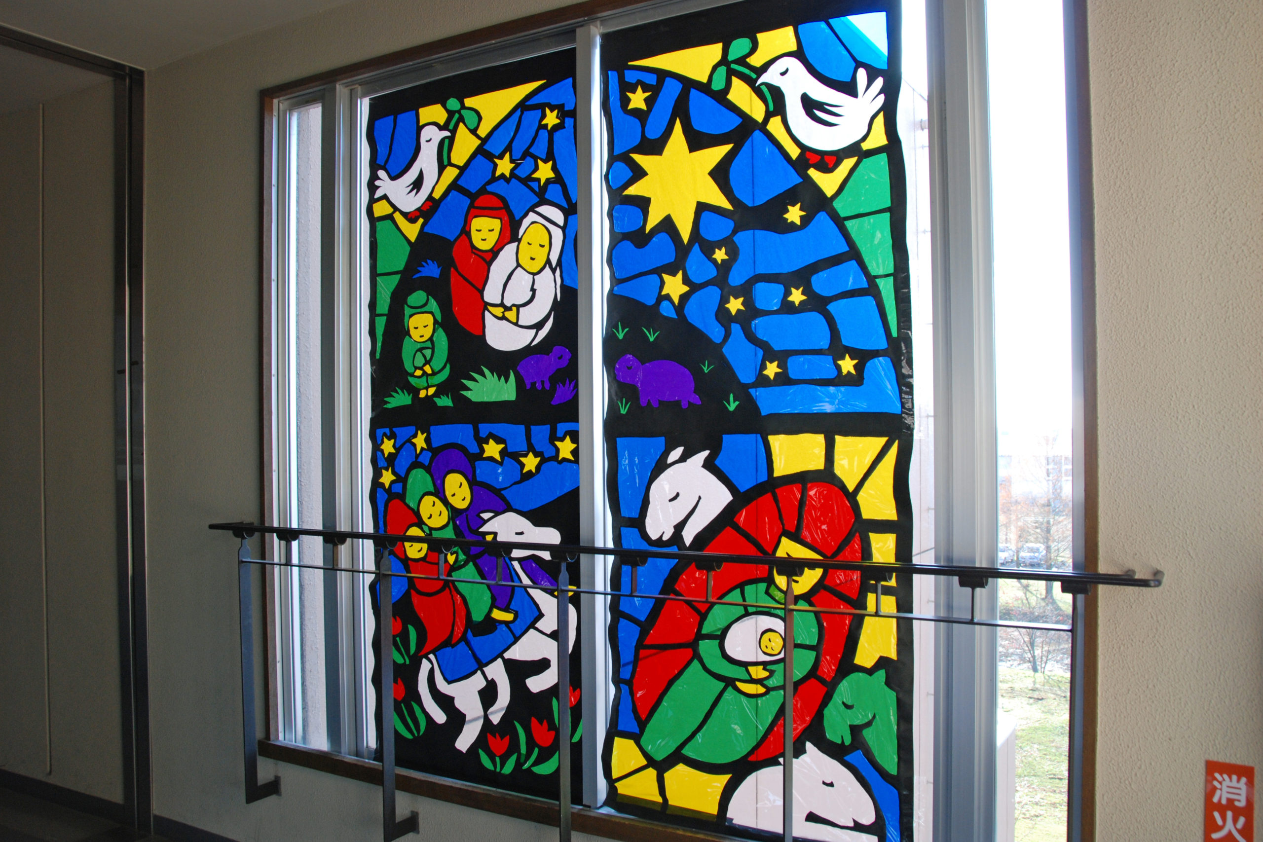 敬和学園大学のあちらこちらに学生と教職員が集まり、クリスマスのステンドグラス作りや飾りつけを行いました。今年初めての挑戦となるステンドグラス作りは細かい手作業のため学生も教職員も真剣そのもの。1年生たちは先輩に優しくこつを教えてもらいながら楽しそうに飾り付けをしていました。
