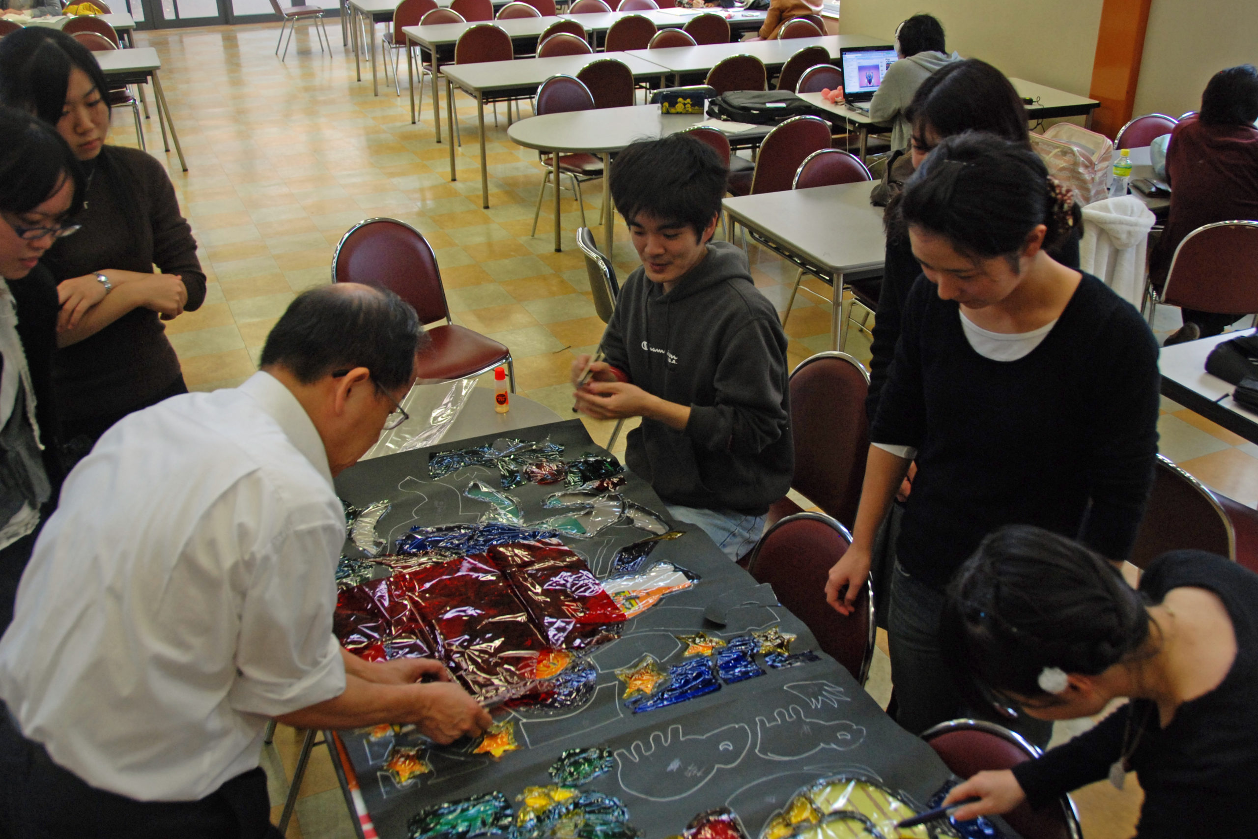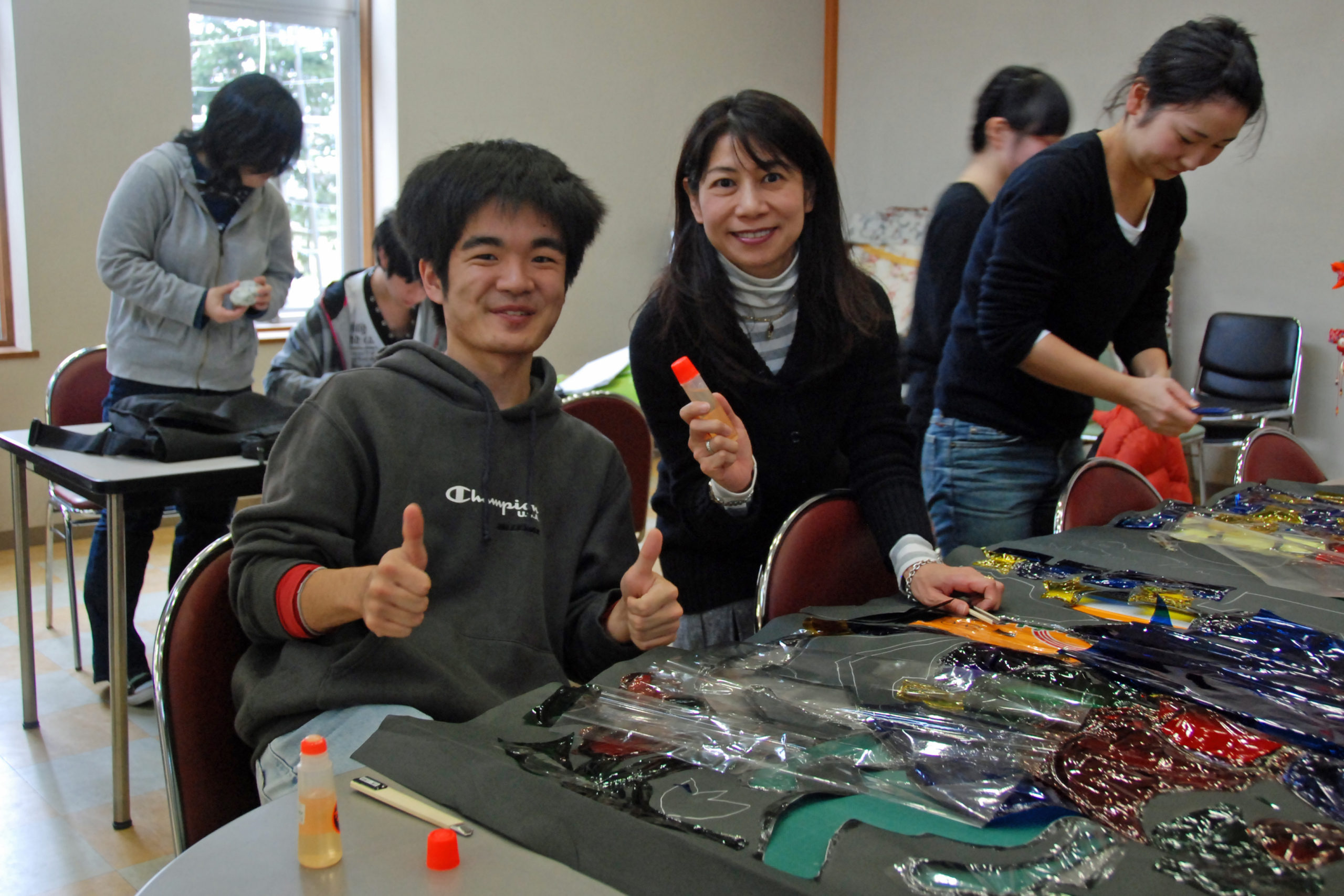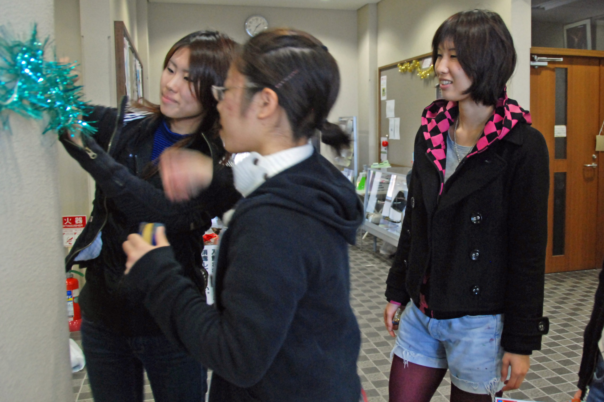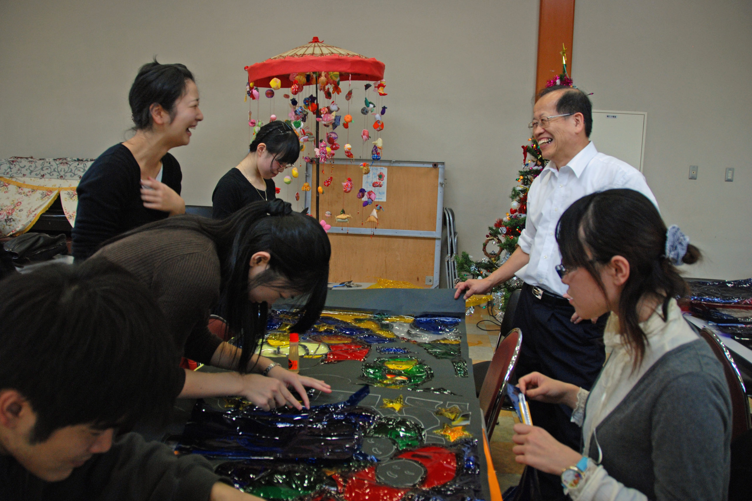 敬和学園大学のあちらこちらに学生と教職員が集まり、クリスマスのステンドグラス作りや飾りつけを行いました。今年初めての挑戦となるステンドグラス作りは細かい手作業のため学生も教職員も真剣そのもの。1年生たちは先輩に優しくこつを教えてもらいながら楽しそうに飾り付けをしていました。