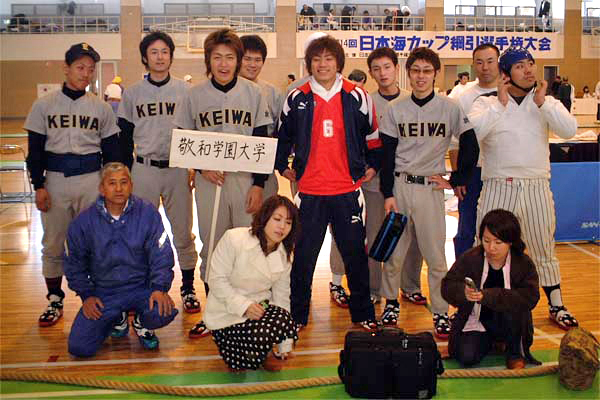 メンバーは、硬式野球部を中心としてサッカー部やバレー部の有志で構成され、オフシーズンのトレーニングの一環として練習してきました。普段は、バスの運転を行っている本学施設係の高橋満さんが「日本綱引連盟公認審判員」であり、高橋さんの指導のもと練習を積んできた結果の初勝利です。この1勝をあげるのに3年以上かかるチームもあることから、2回目の大会参加にしての初勝利は立派なものといえます。