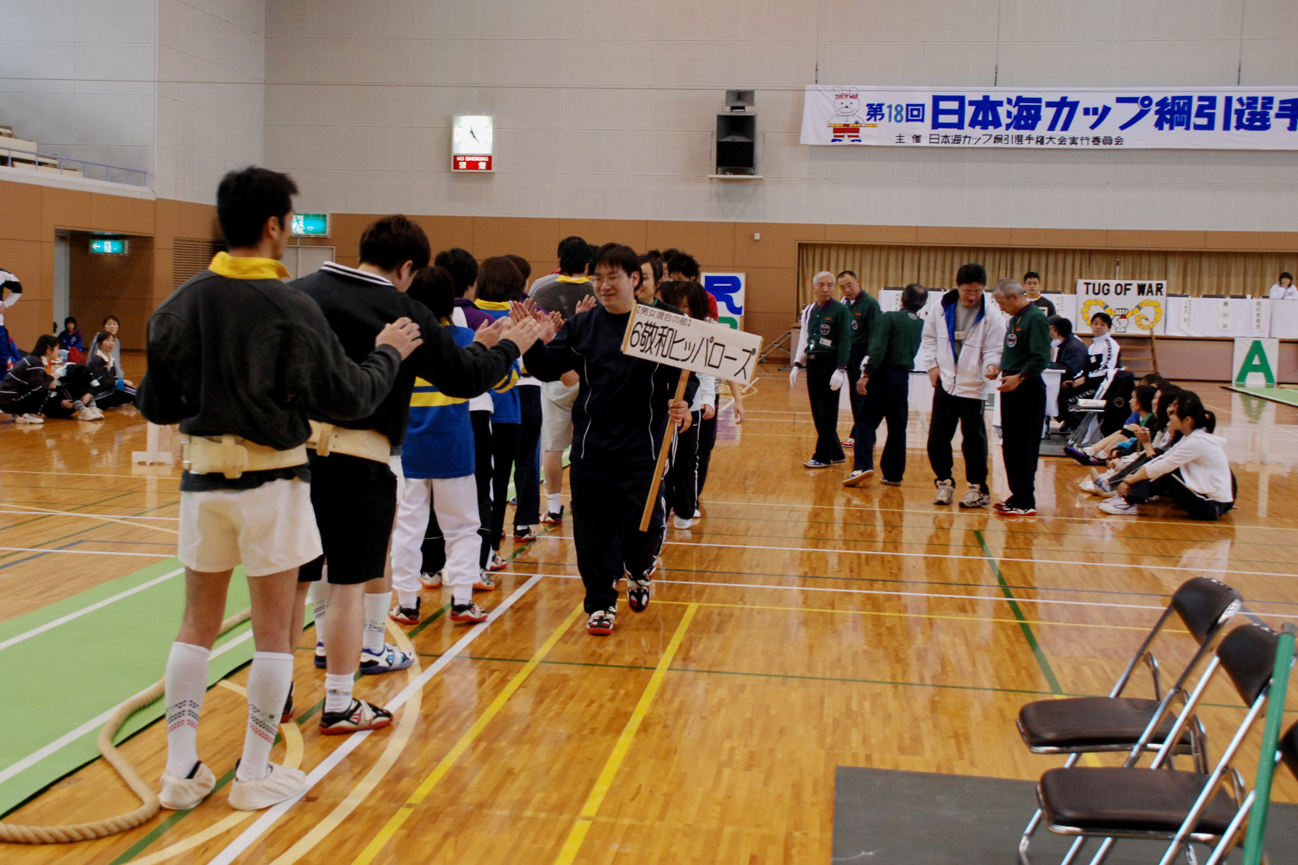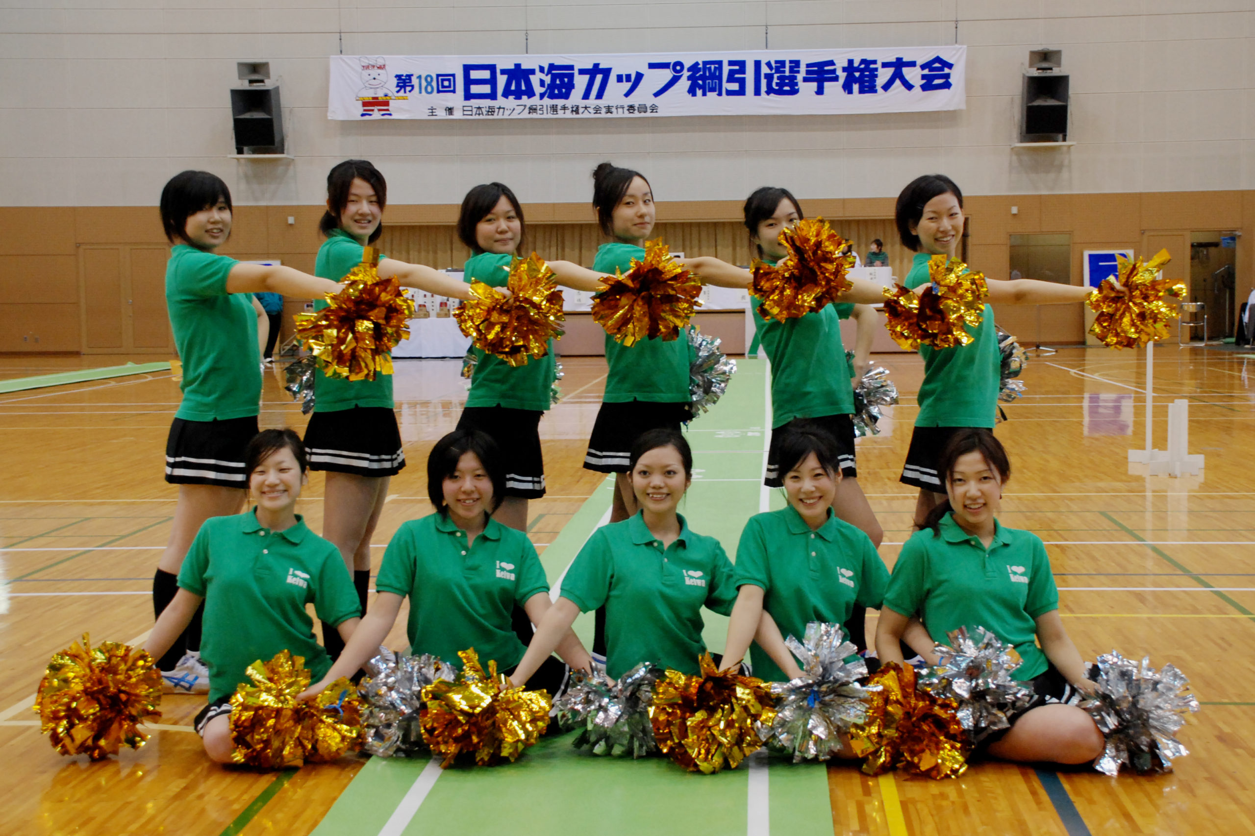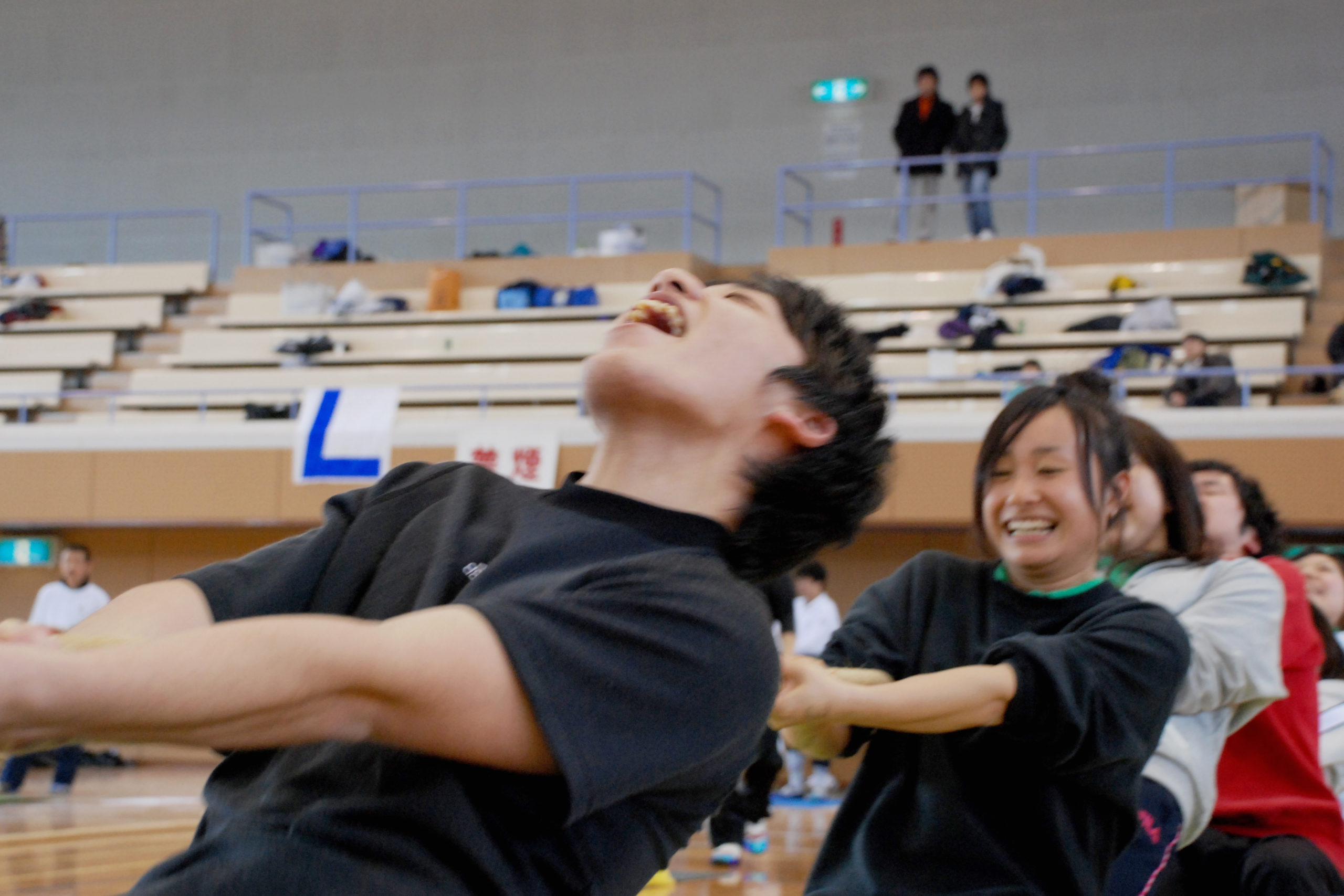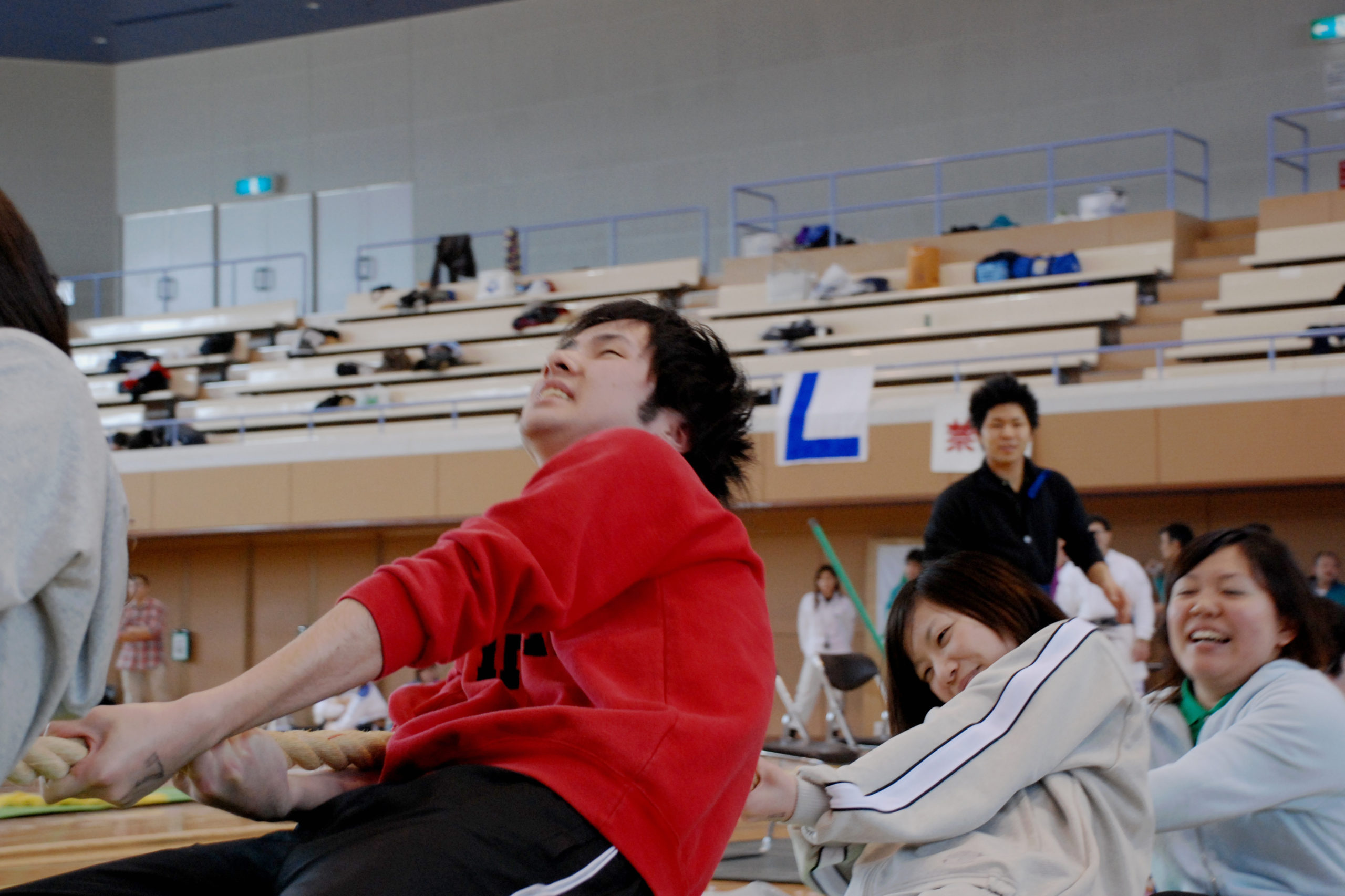敬和学園大学からは、男女混合の部に3チームと男子一般の部に1チーム、それぞれ地元の自衛隊の方に助っ人として加わっていただき、参加しました。この大会の審判長を務める、高橋満さん(敬和学園大学 施設係職員)の指導の下、大会前の数ヶ月、学生・教職員とも大学の体育館を使って練習を重ねてきました。大会当日は、学長も応援にかけつけてくださり、全員がひとつになって力いっぱい綱を引きました。また、開会式や休憩時間などでは、本学のブラスバンド部の演奏やチアリーダー部の踊りがあり、大会を盛り上げるのに一役かいました。