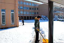 雪が降りました。例年にくらべるとわずかな積雪でしたが、それでもこの冬一番の大雪です。今年は暖冬だったので、敬和学園大学でもほとんど雪を見ないまま、冬を終えようとしていたところでした。 雪の降った朝には、誰が声をかけるわけでもなく、早く出勤した職員からスコップを持って、正面から裏手の出入り口まで除雪し、学生や来客者のための路を確保します。すでに春休みに入って、学生の姿もまばらになっていますが、今朝もいつもと変わらず、雪かきを行いました。