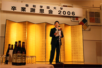 卒業式に引き続いて、新潟市内のホテルに会場を移して「卒業謝恩会2006」が開催されました。 これは卒業生からお世話になった保護者の方々並びに大学教職員への感謝の気持ちを表すものです。卒業生たちはお世話になった教職員を囲んで楽しかった大学生活を思い起こし、時間を忘れるほど会話がはずむ会となりました。