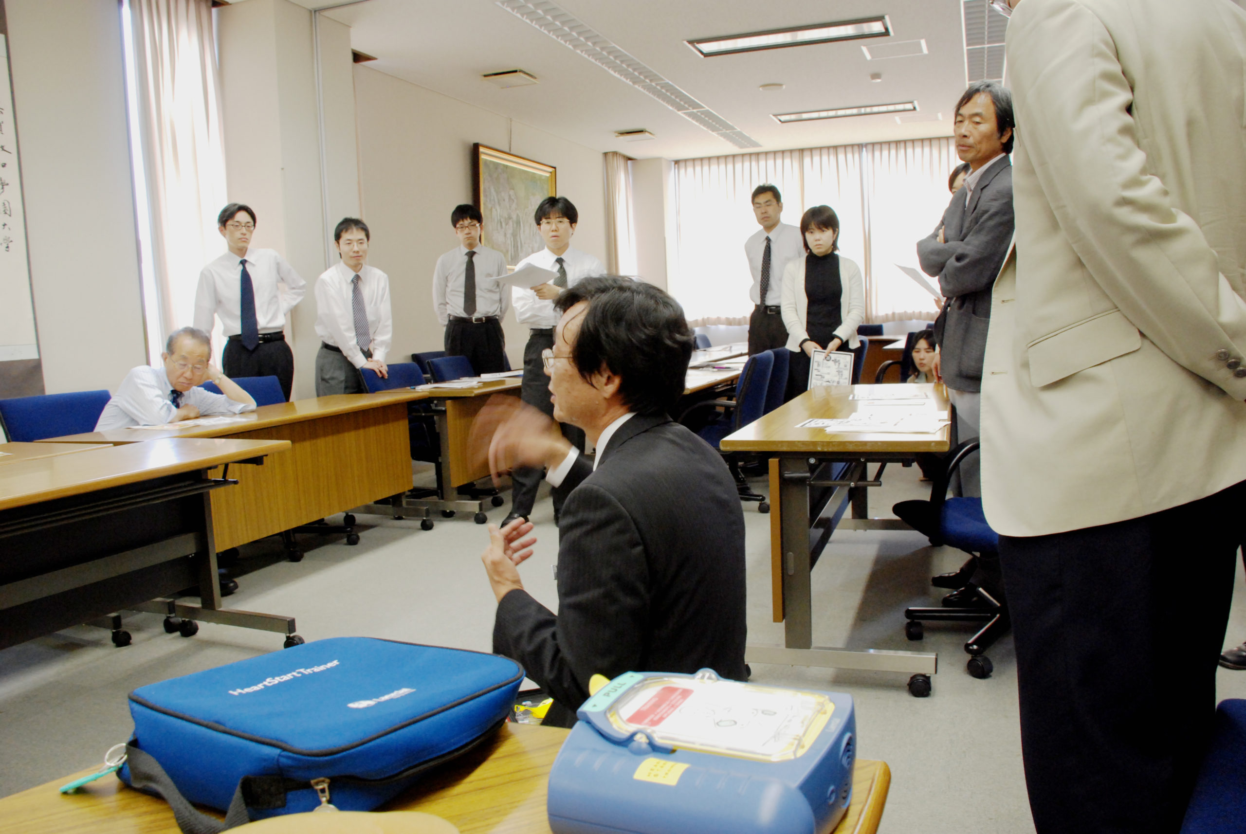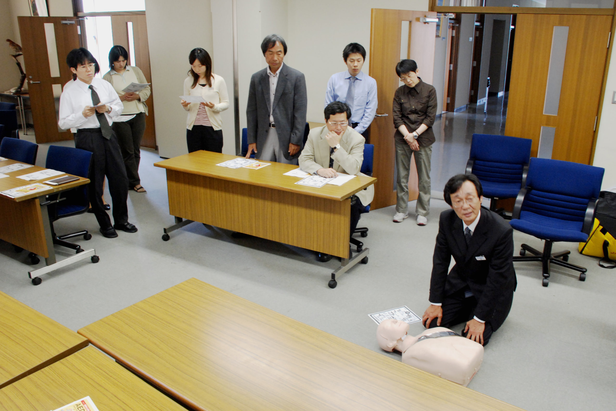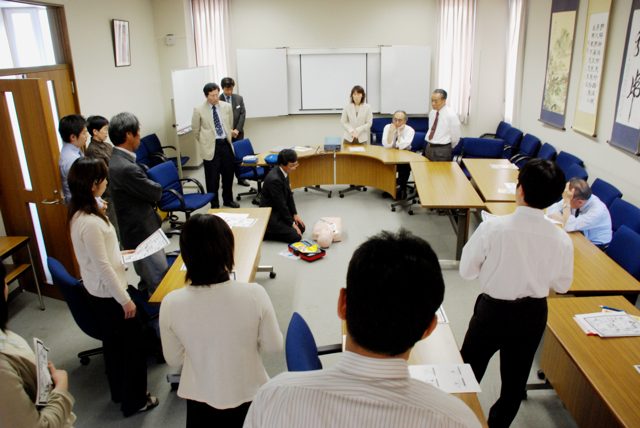 敬和学園大学では、教職員を対象とした「AED(自動体外式除細動器)を用いた一時救命措置」の講習会を開催しました。この講習会には、15名の教職員が集まり、「AED」の必要性と使用上の注意、そして心肺蘇生訓練用の人形を使った一時救命措置の体験を行いました。