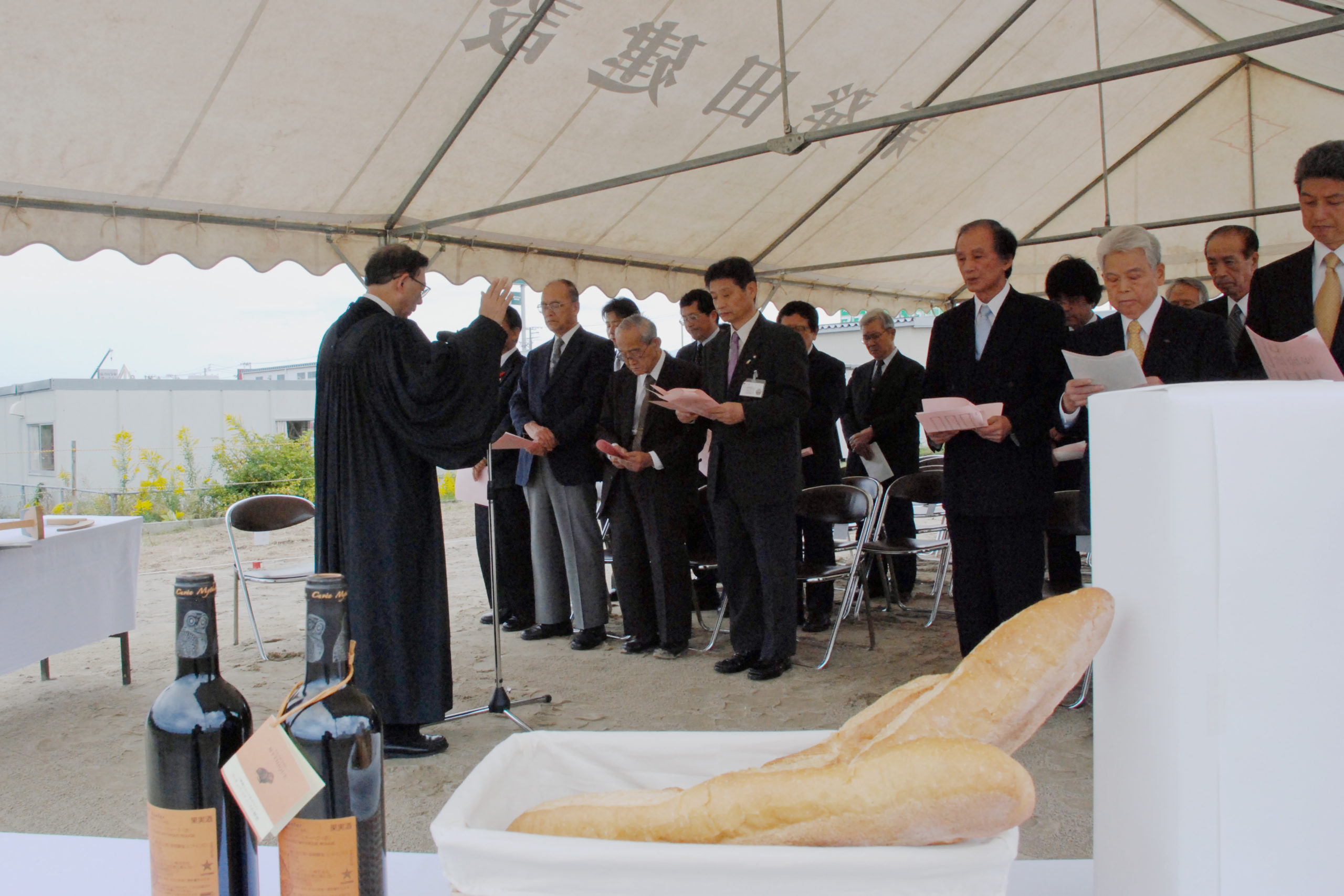 グループホームとは、高齢者のみなさんが共同生活を営む住居のことです。入居者のみなさんは、日常生活をお手伝いするスタッフとともに、地域社会に溶け込みながら生活していきます。起工式では参加者全員で、「のぞみの里」がこの地域に受け入れられ、そして奉仕していけるようにと祈りました。この祈りは聖書に込められ、施設が建つ敷地の下に埋められました。
