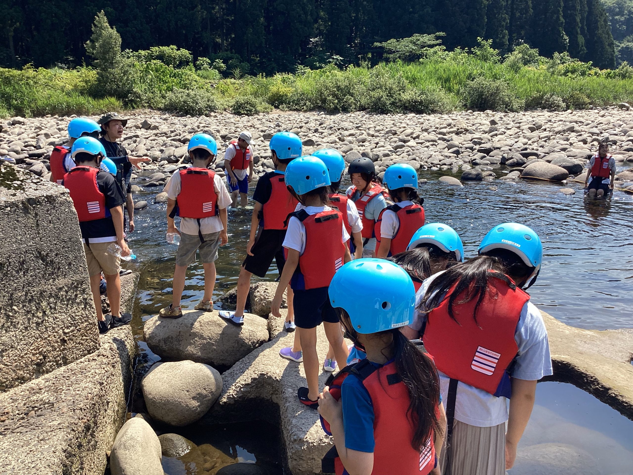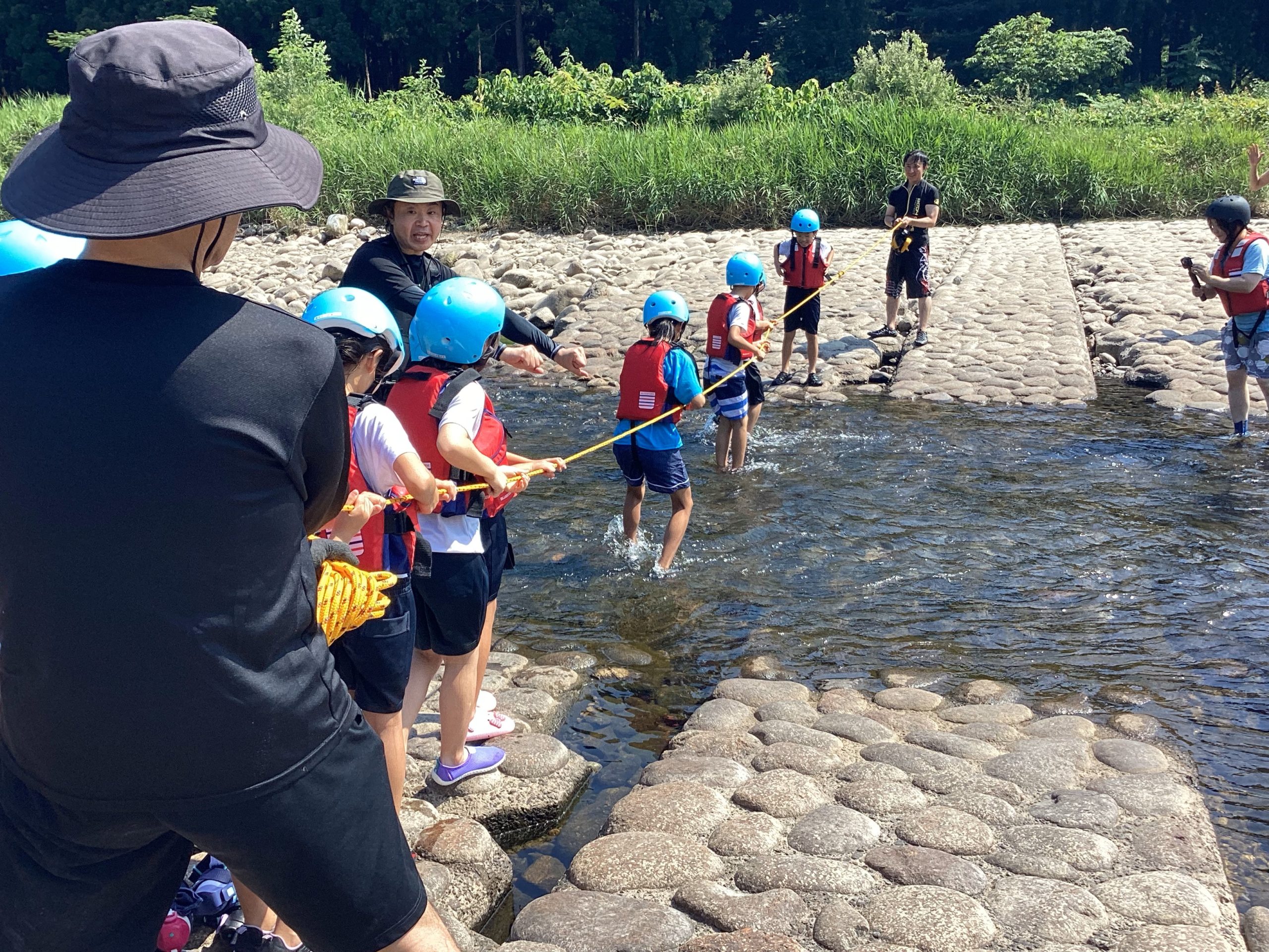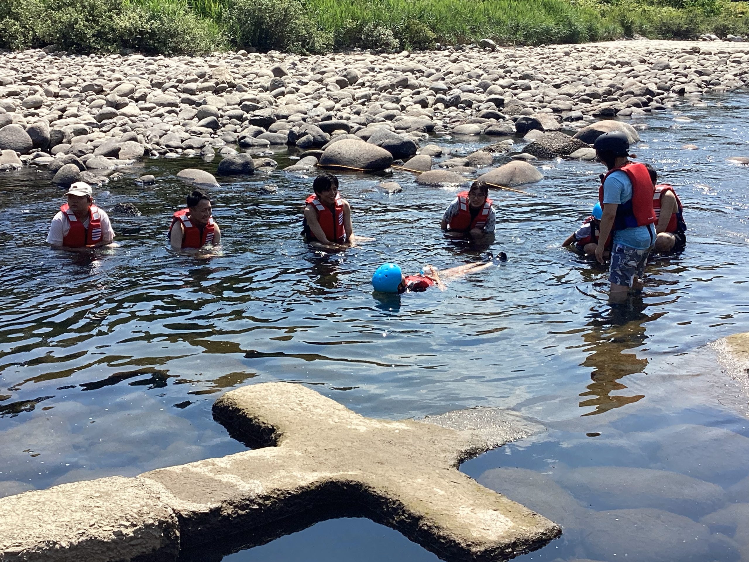 滝谷森林公園では子どもたちがライフジャケットを着用して川に入り、流されることの怖さを体験しました。そして流された時の対策として、水面に浮かんで救助を待つということを学びました。当日はかなり暑かったので、水の中に入るとかなり涼しく感じましたが、命を守るためのいかに行動すべきかを子どもたちは真剣な眼差しできいていたのが印象的でした。。