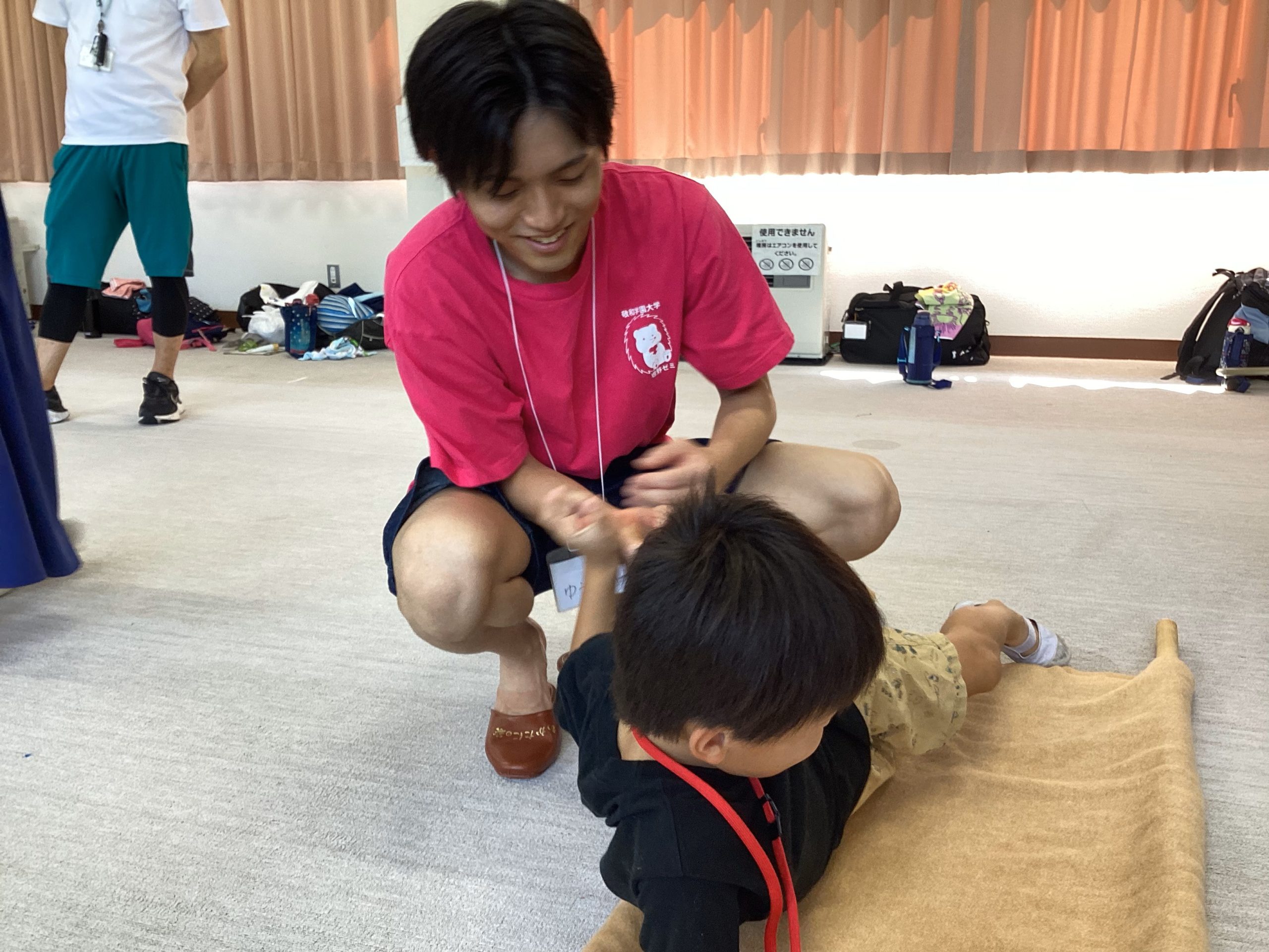 あかたにの家では、私たちも交じりながら避難所生活の準備や毛布で担架を作って搬送をしてみたりと、災害時の対応と知識を学びました。特に身近にある日用品で人を担ぐことができる担架を作れることを知った時はとてもびっくりしました。