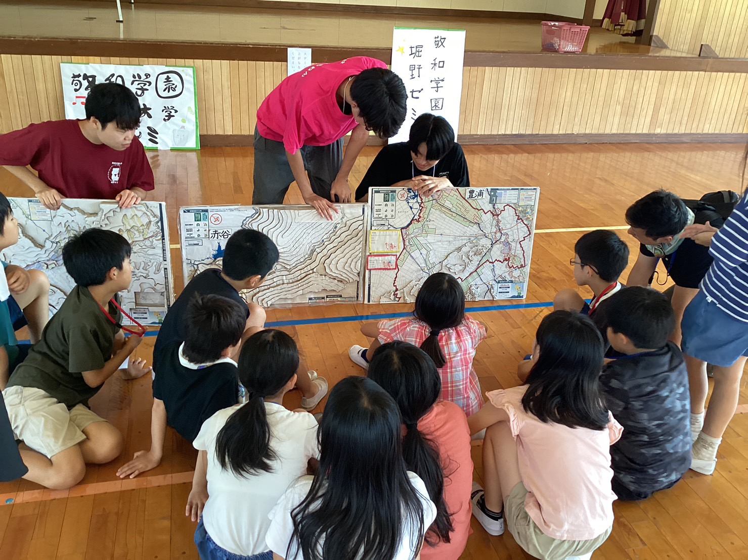 防災キャンプ2日目には、私たちの活動のひとつとしてダンボールで制作した防災ジオラマを子どもたちに紹介しました。子どもたちはジオラマに興味津々で、どこに自分たちの学校や家があるのか、そして避難所はどこにあるのかと目を凝らしていました。