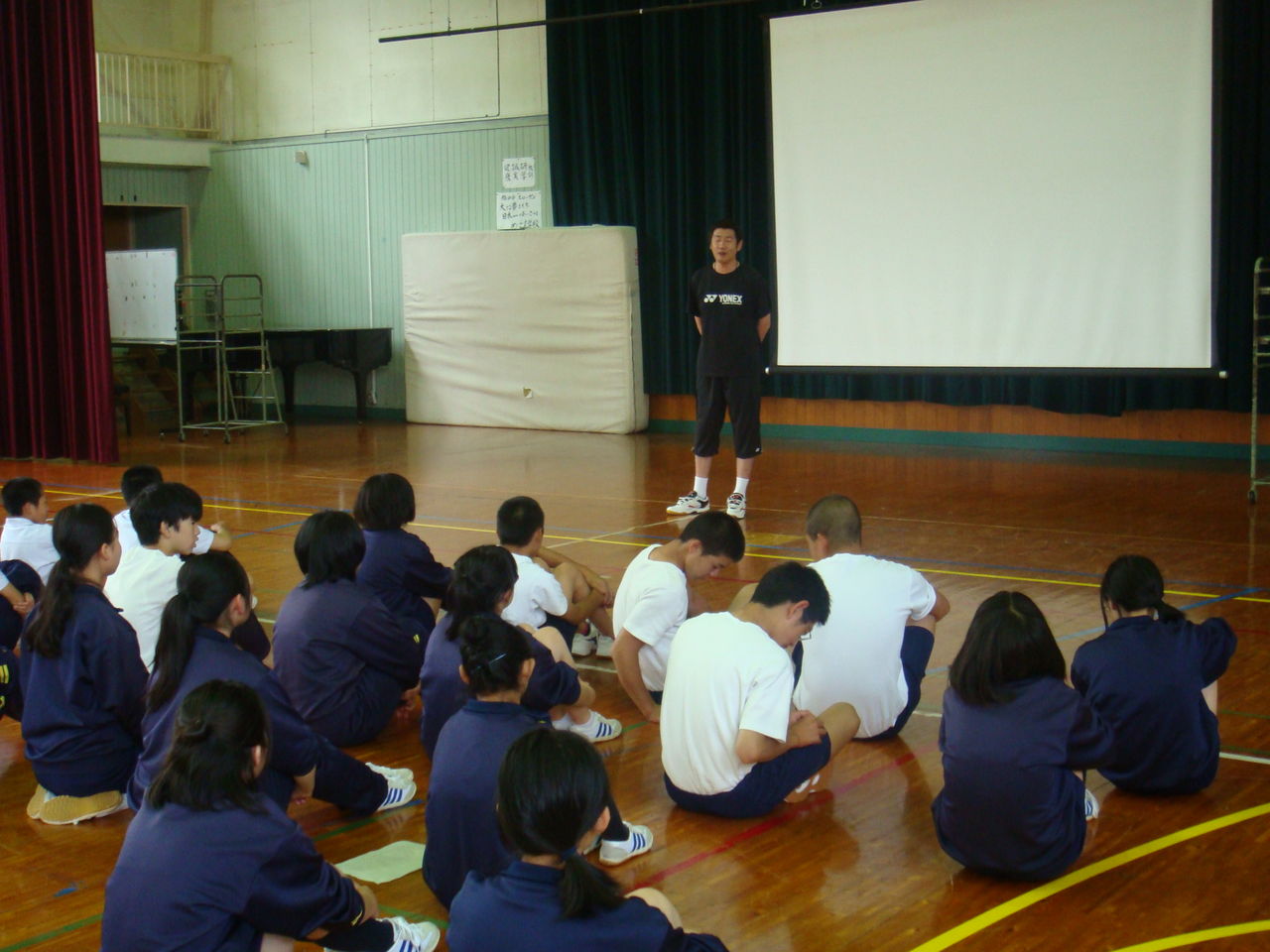 中学生を対象にするのは今回が初めてでした。初めに全校生徒約50名に対して少しスポーツの楽しさについて話をさせてもらってから、3年生の20名ほどを対象にバドミントンを指導してきました。