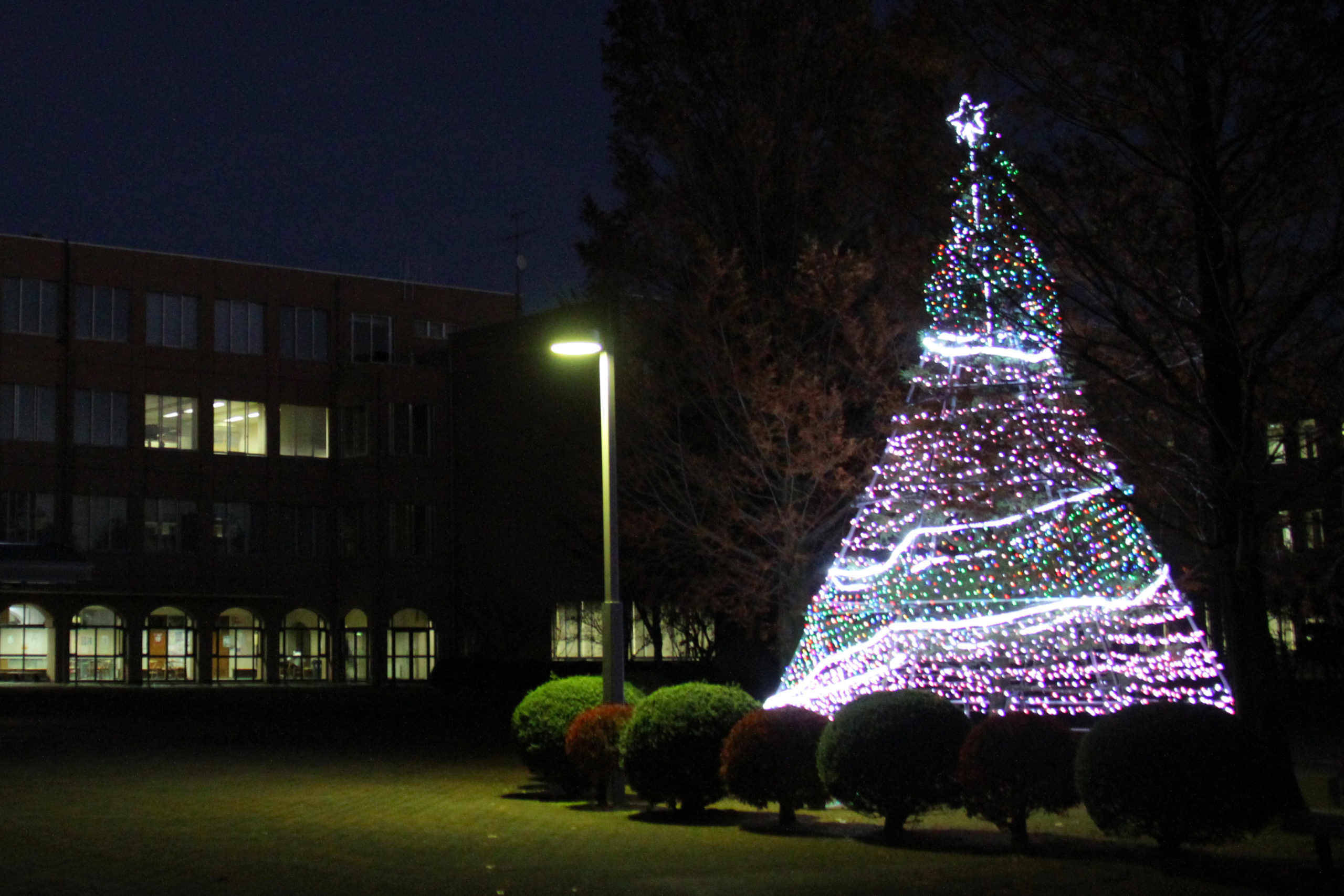 * 点灯式の後は、12月25日月曜日までの毎日16時30分から23時30分の間、点灯し続けます。大学正面入り口側と新新バイパス側からの、2つのツリーをご覧いただくことができます。