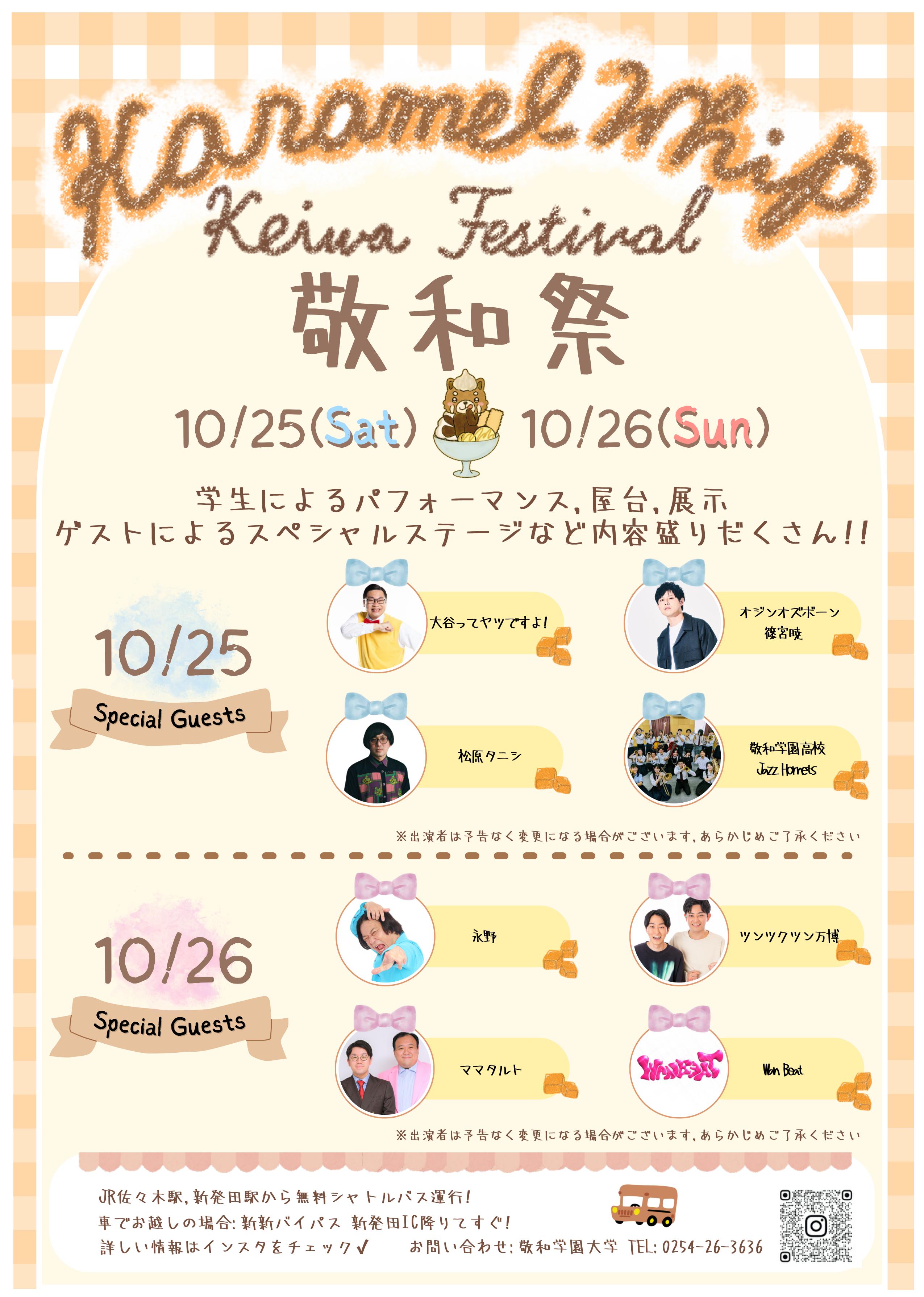 学生たちによるたくさんのパフォーマンスと展示、屋台があります。そして、10月25日(土)にはゲストのオジンオズボーン篠宮暁、松原タニシ、大谷ってヤツですよ!によるお笑いライブ、敬和学園高校のJazz Hornetsによるライブを開催、26日(日)には、ゲストのママタルト、永野、ツンツクツン万博によるお笑いライブ、ゲストのWan Beatによるライブを開催いたします。(*出演者は予告なく変更になる場合がございます。予めご了承ください。)