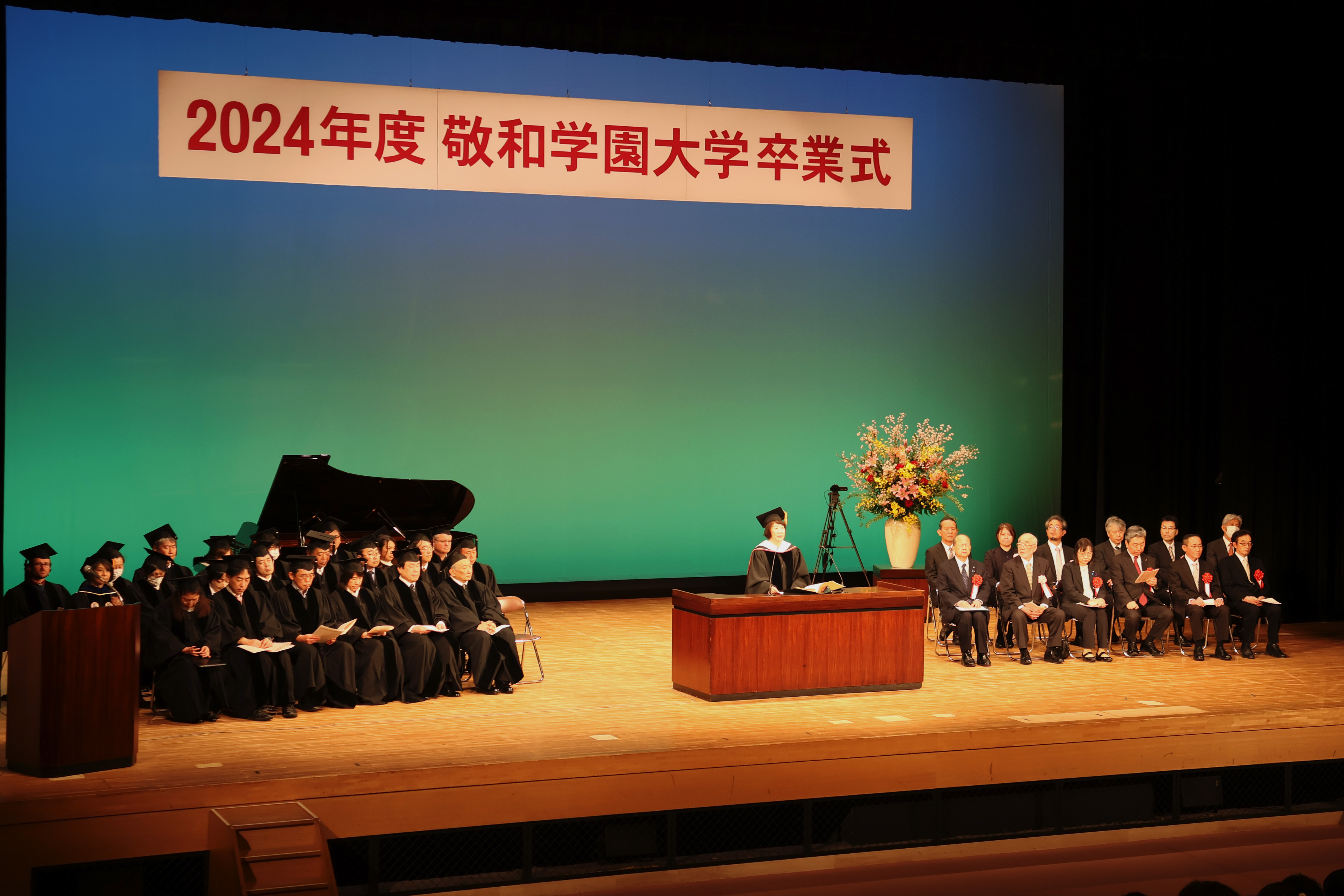 敬和学園大学では、来る3月19日(木)に、下記のとおり卒業式を行います。卒業式では、すべての卒業生が順に壇に上がり、一人ひとりが金山愛子学長から「卒業証書・学位記」を受け取ります。