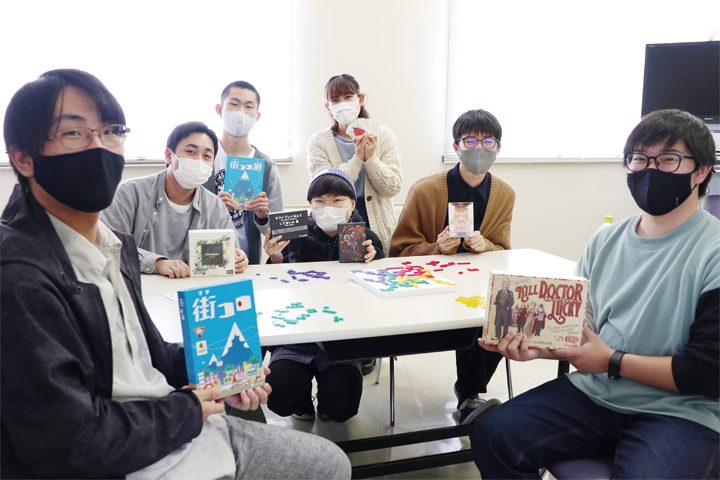 シンプルでわかりやすいものから知的で奥深いものまで、世界中のさまざまなボードゲームを持ち寄って遊んでいます。(国際文化学科 金安優希)
