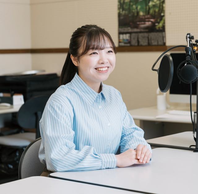 高校生の時から映像やコンテンツ制作に興味があったものの、専門分野に絞る覚悟がなかったため、人文系の幅広い学びがある敬和学園大学を選択しました。今、力を入れている授業としては、発声や滑舌、表現方法を学ぶ「アナウンス・ナレーション実習」です。地元コミュニティFMのラジオ番組MCとして実践することで、話し方や伝え方について新たな気づきがありました。